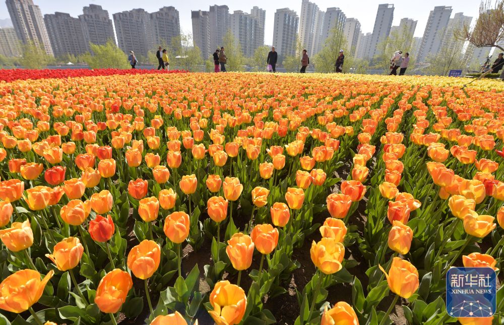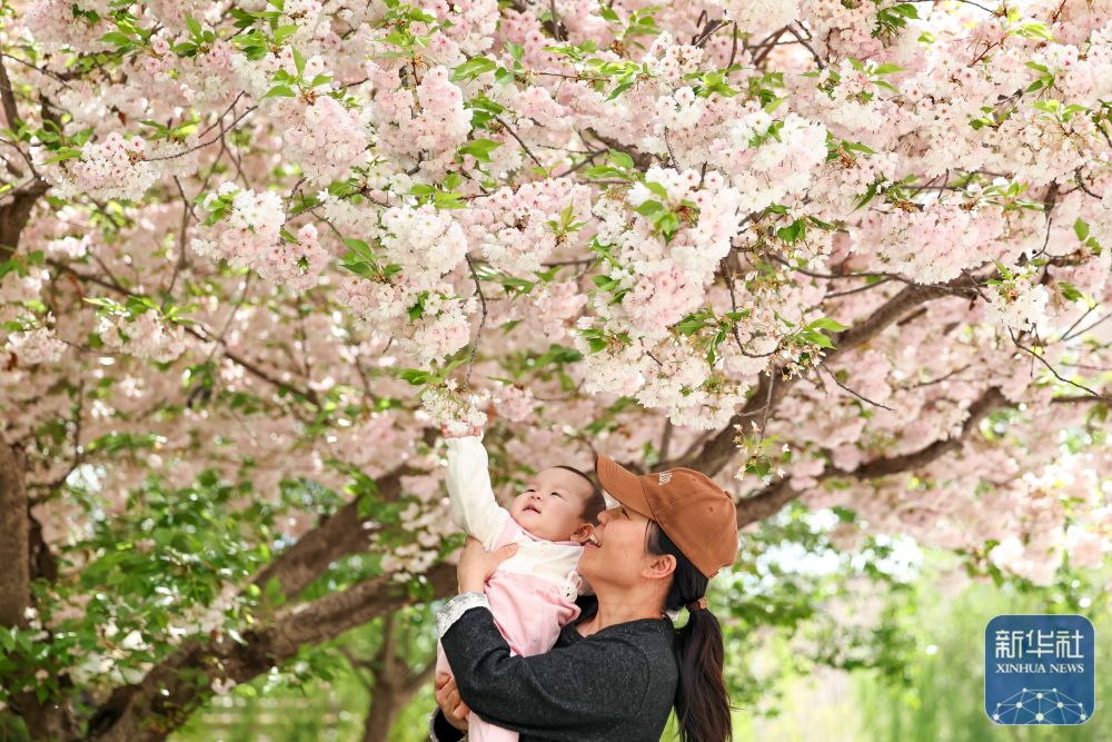 ↑ 4月18日,在甘肃省兰州市城关区新港城小区内,居民带着孩子赏花休闲。新华社发(侯崇慧摄)