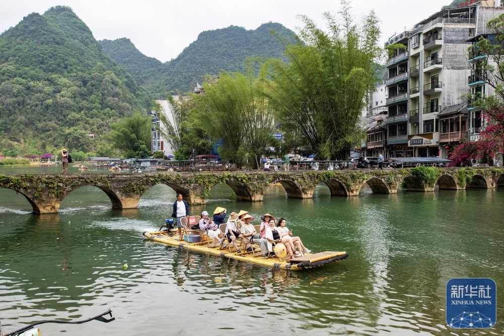 ↑ 4月17日,游客在广西靖西市鹅泉景区乘坐竹筏游览。新华社发(赵京武摄)