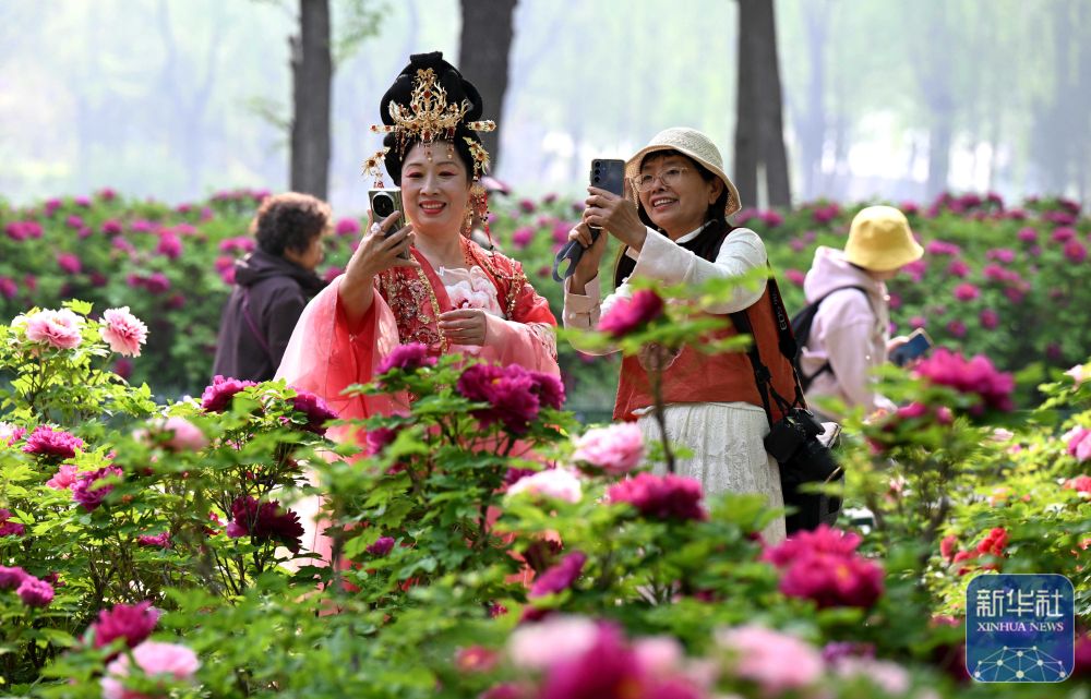 ↑ 4月15日,游客在河北省石家庄市植物园内牡丹园赏花拍照。新华社发(陈其保摄)