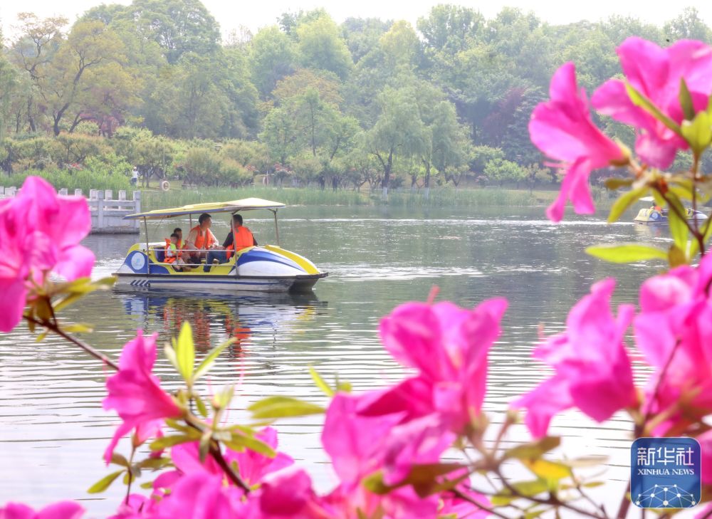 ↑ 4月18日,游人在湖北省武汉市青山公园乘船赏花游览。新华社发(赵军摄)