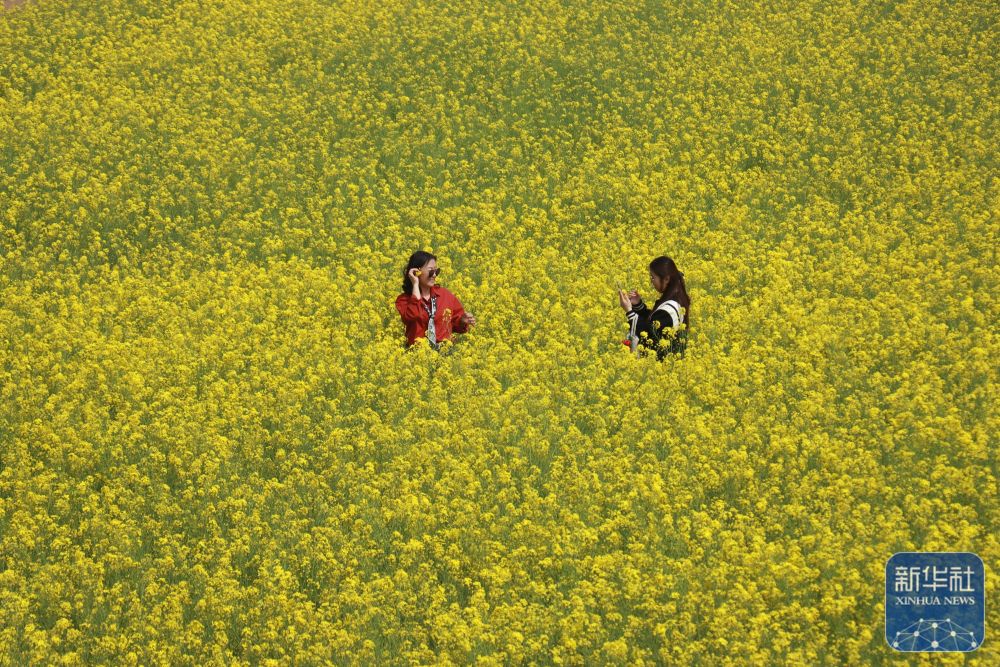 ↑ 4月17日,游客在河南省安阳市内黄县亳城镇油菜花田拍照。新华社发(刘肖坤摄)