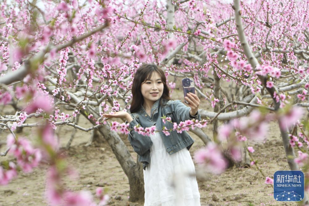 ↑ 4月16日,游客在甘肃省临夏回族自治州临夏县南塬乡张河西村桃园赏花拍照。新华社发(史有东摄)
