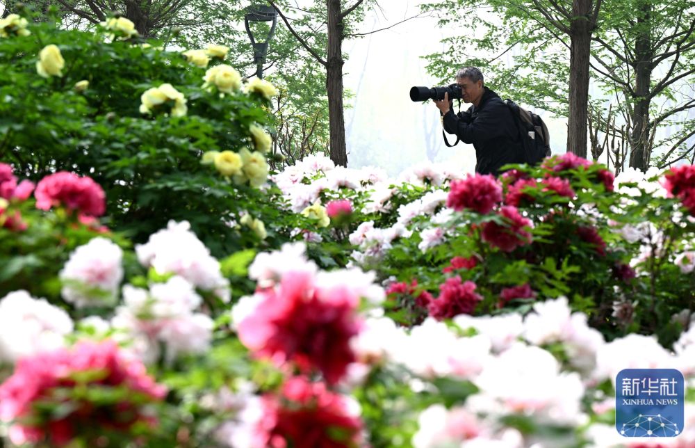 ↑ 4月18日,摄影爱好者在河北省石家庄市植物园牡丹园拍照。新华社发(陈其保摄)