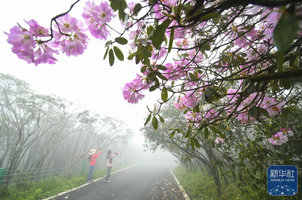 ↑ 4月17日,游客在湖南省永州市双牌县阳明山国家森林公园杜鹃花海赏花拍照。新华社发(周秀鱼春摄)