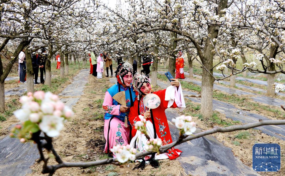 ↑ 4月18日,甘肃省平凉市静宁县界石铺镇李堡村,来自县戏剧家协会的秦腔演员在梨园打卡拍照。新华社发(王毅摄)