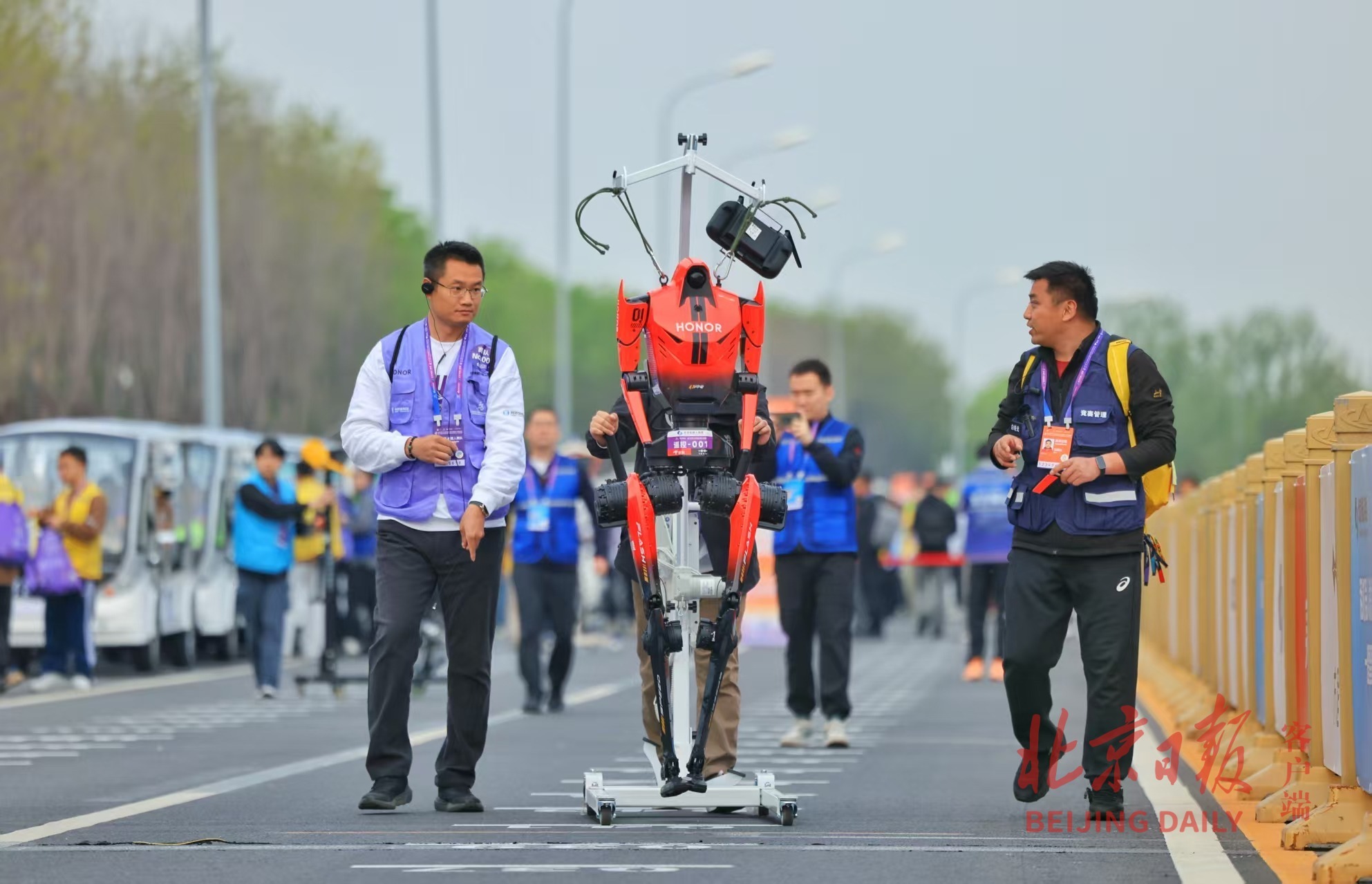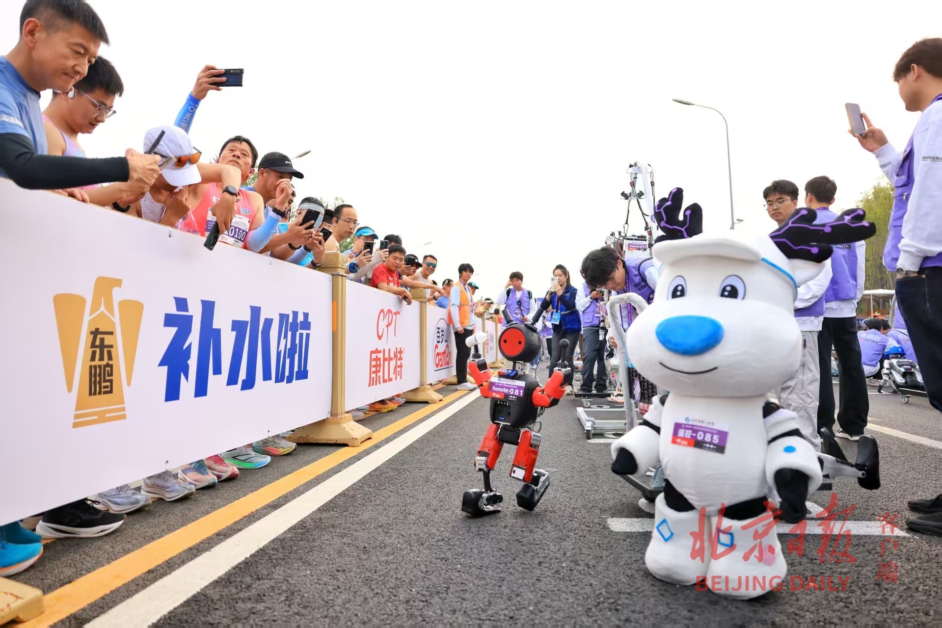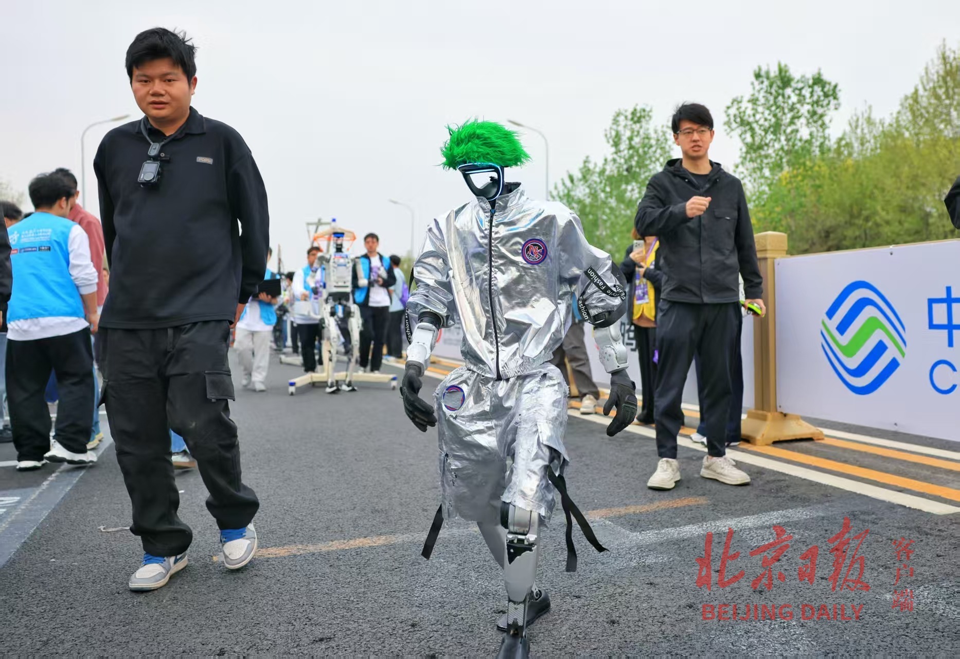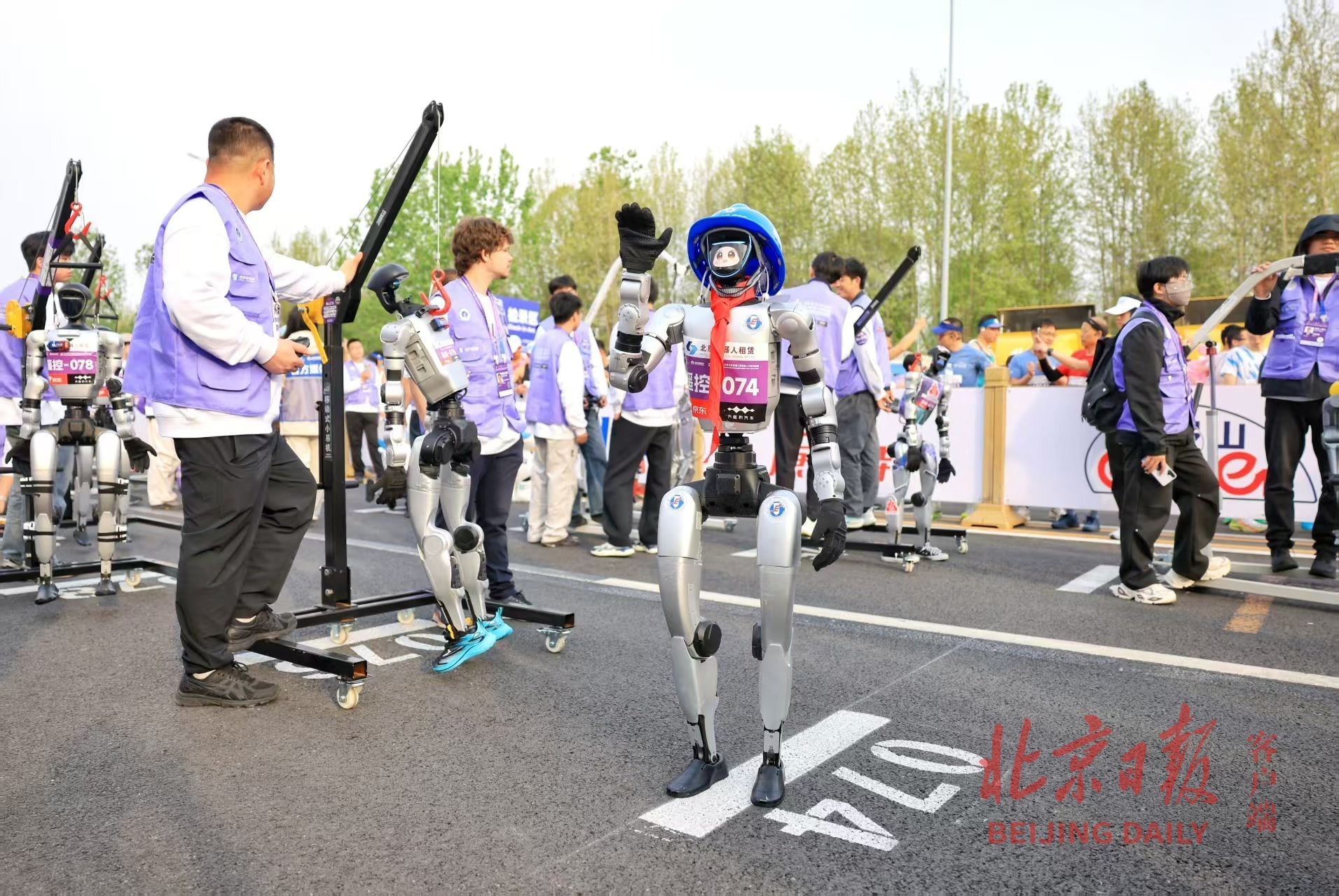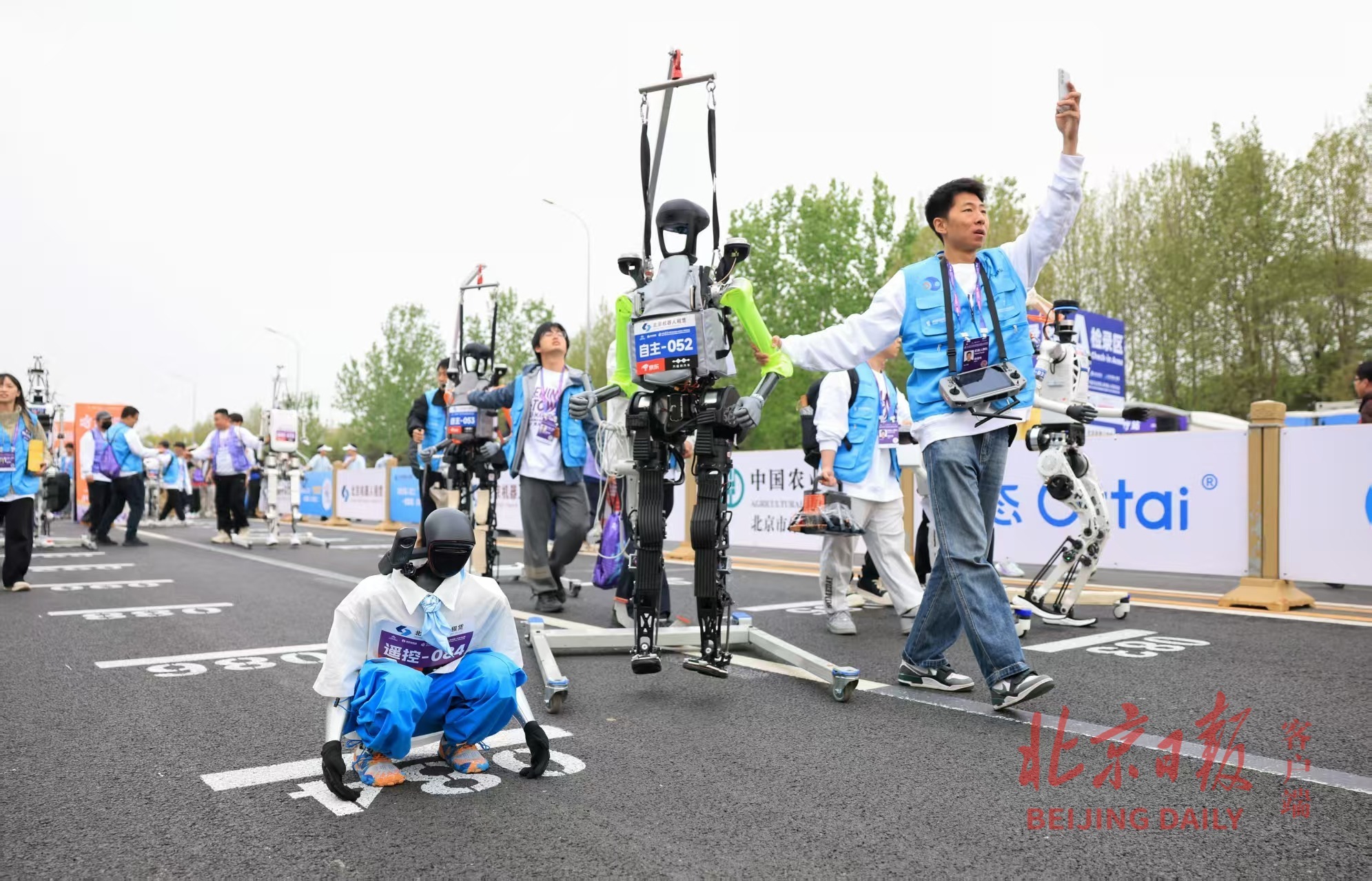2026人形机器人半马,参赛机器人赛前热身。