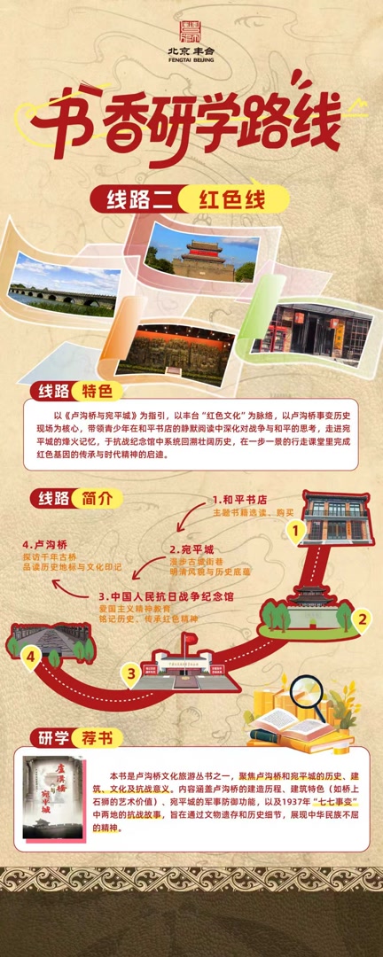 红色线则紧扣《卢沟桥与宛平城》,从和平书店的静默阅读开始,走进宛平城、抗战纪念馆和卢沟桥历史博物馆。