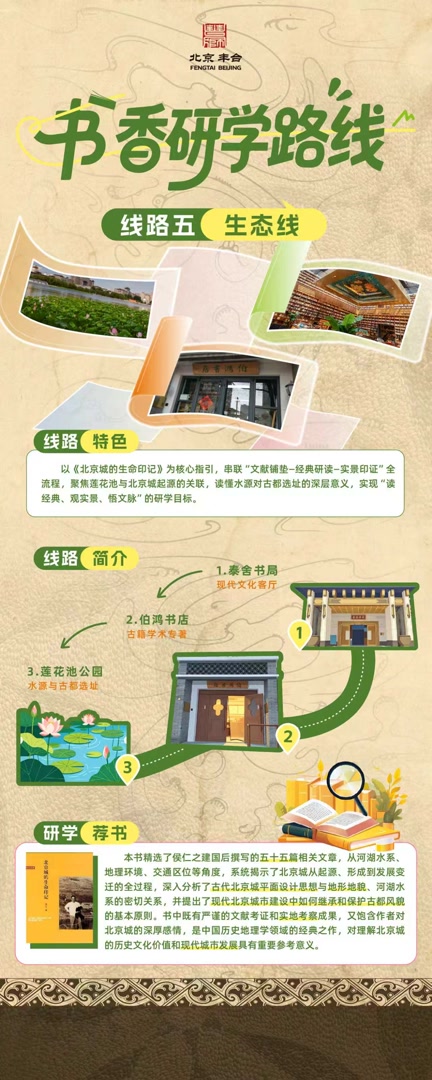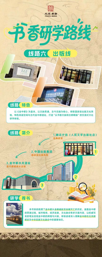 另外三条线路同样各具特色:文博线探访大葆台汉墓遗址,读《北京大葆台汉墓》,实现“读史+实景”深度融合;生态线读《北京城的生命印记》,聚焦莲花池与北京城起源的关联,泰舍书局、伯鸿书店与莲花池公园免费开放;出版线则在人民文学出版社“朝花夕拾”书店读《金中都》,随后途经中国出版集团,最终抵达金中都水关遗址,感受800年前的城市排水智慧。