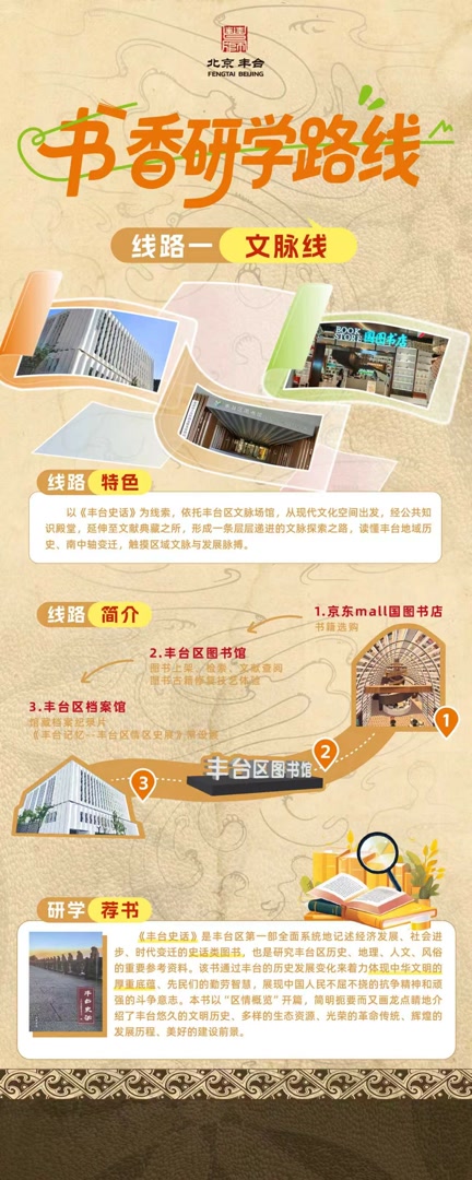 文脉线以《丰台史话》为线索,串联京东mall国图书店、丰台区图书馆和丰台区档案馆,让孩子们在现代阅读空间与历史档案之间穿梭,读懂丰台地域沿革。