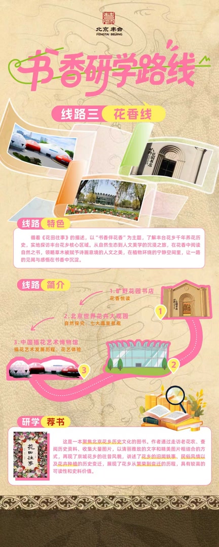 丰台区图书馆最新推出的6条“书香研学”路线,联合了该区档案馆、中国人民抗日战争纪念馆、世界花卉大观园等多处文博场馆,以“阅读+文旅”的方式,将地方文献中的历史元素转化为可实地探访的打卡点位,让孩子们带着书去旅行。