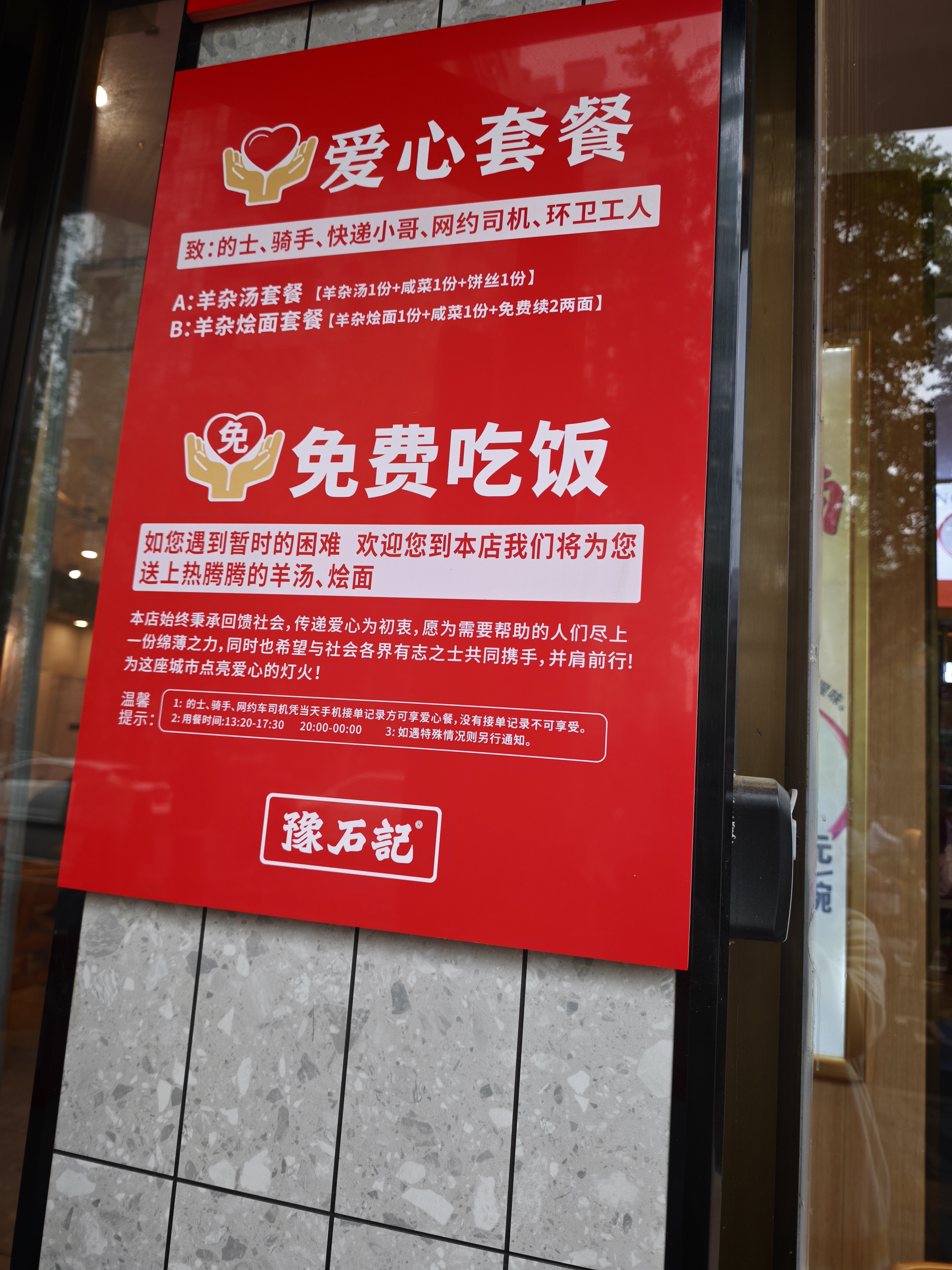上午11时,位于朝阳区酒仙桥的豫石记羊汤馆内已有客人落座,装着羊汤的大锅里正咕嘟冒泡,店员们麻利地拉面、盛汤、装碗。屋内显眼位置,贴着一张红色告示,上面两段字格外醒目:一段是“爱心套餐,致:的士、骑手、快递小哥、网约司机、环卫工人”;另一段写着“免费吃饭,如您遇到暂时的困难,欢迎您到本店,我们将为您送上热腾腾的羊汤、烩面”。同样的牌子,也挂在门口。