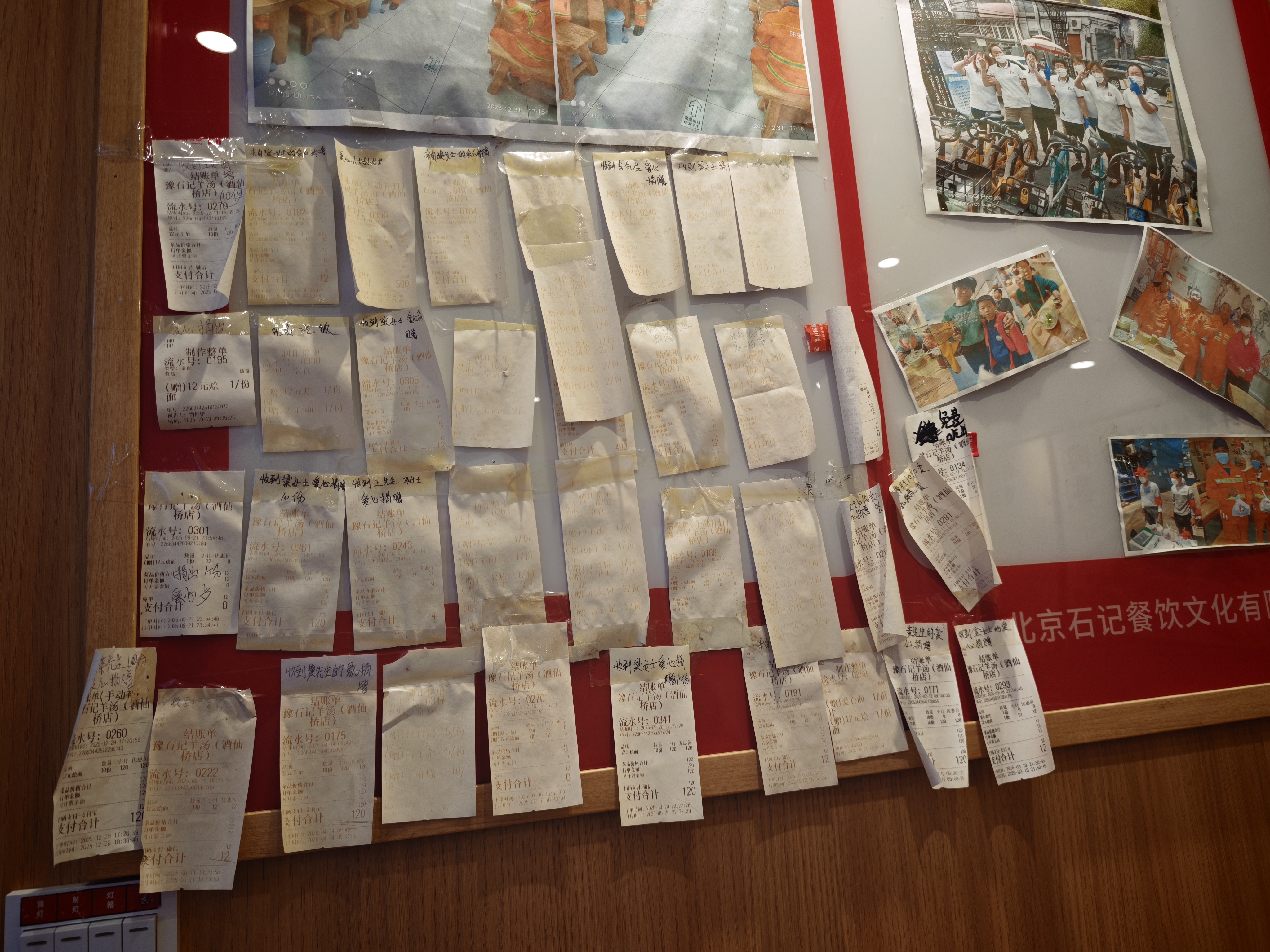 让人动容的是,这份善意正在双向奔赴。店里的一根立柱上贴着不少小票,这是送出和顾客捐赠的免费餐记录:“收到付女士10份爱心捐赠”“收到梁女士10份爱心捐赠”“收到黄先生的爱心捐赠”……有的小票时间久了,字迹已经模糊不清,有的是今年2月、3月的新鲜捐赠。