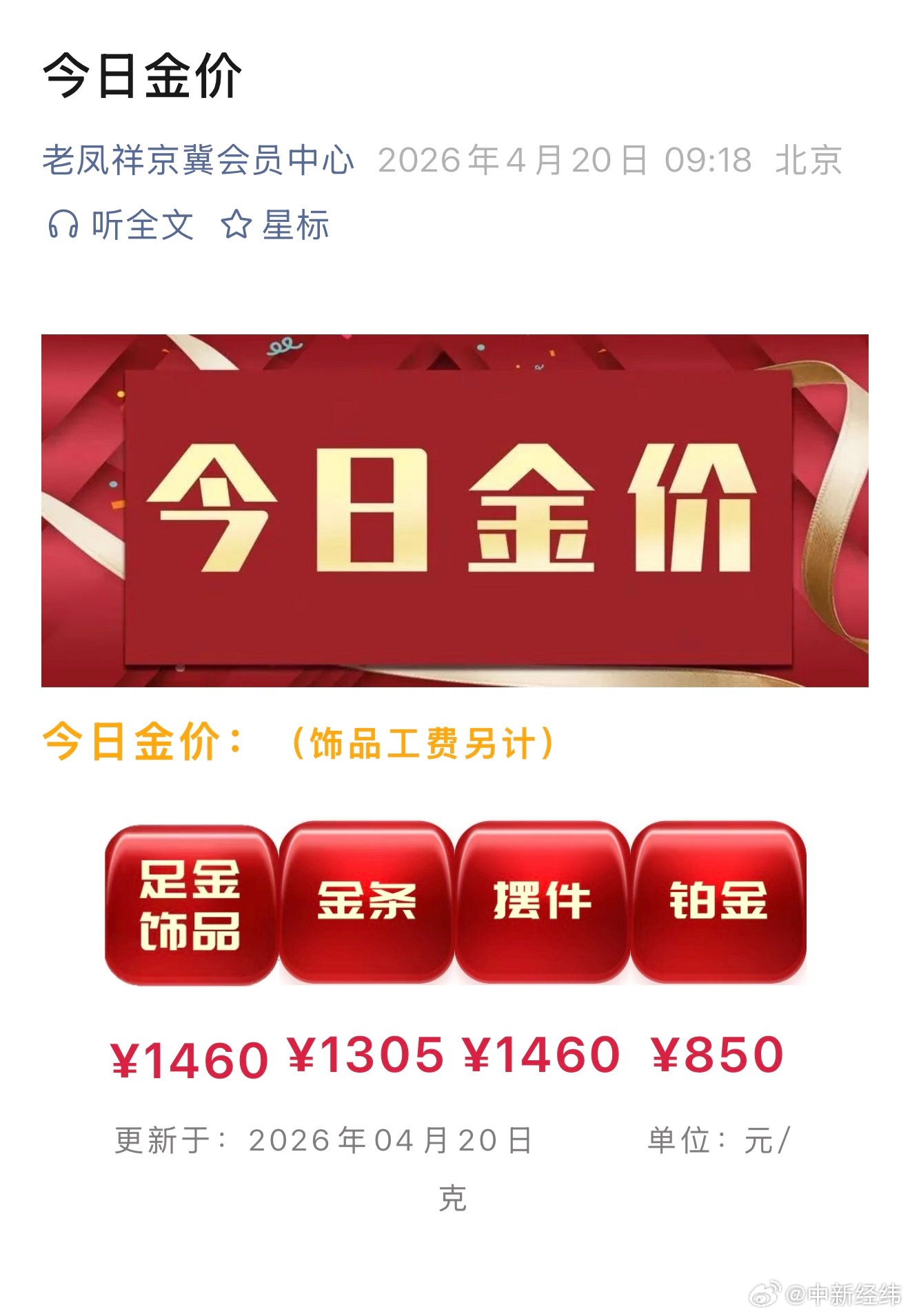 北京时间20日早间,国际油价开盘暴涨,金银价格短线跳水。记者查询,老庙足金饰品标价1461元/克,较前一日1478元/克的价格下跌17元/克。老凤祥足金饰品标价1460元/克,较前一日1475元/克的价格下跌15元/克。