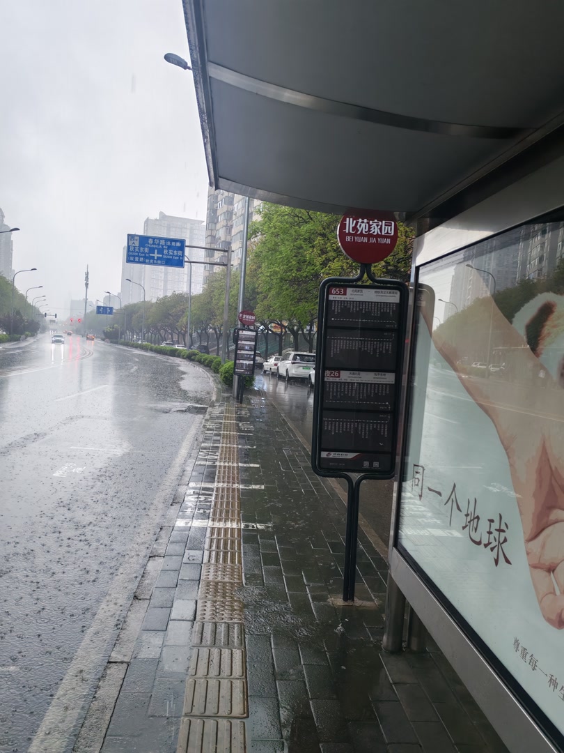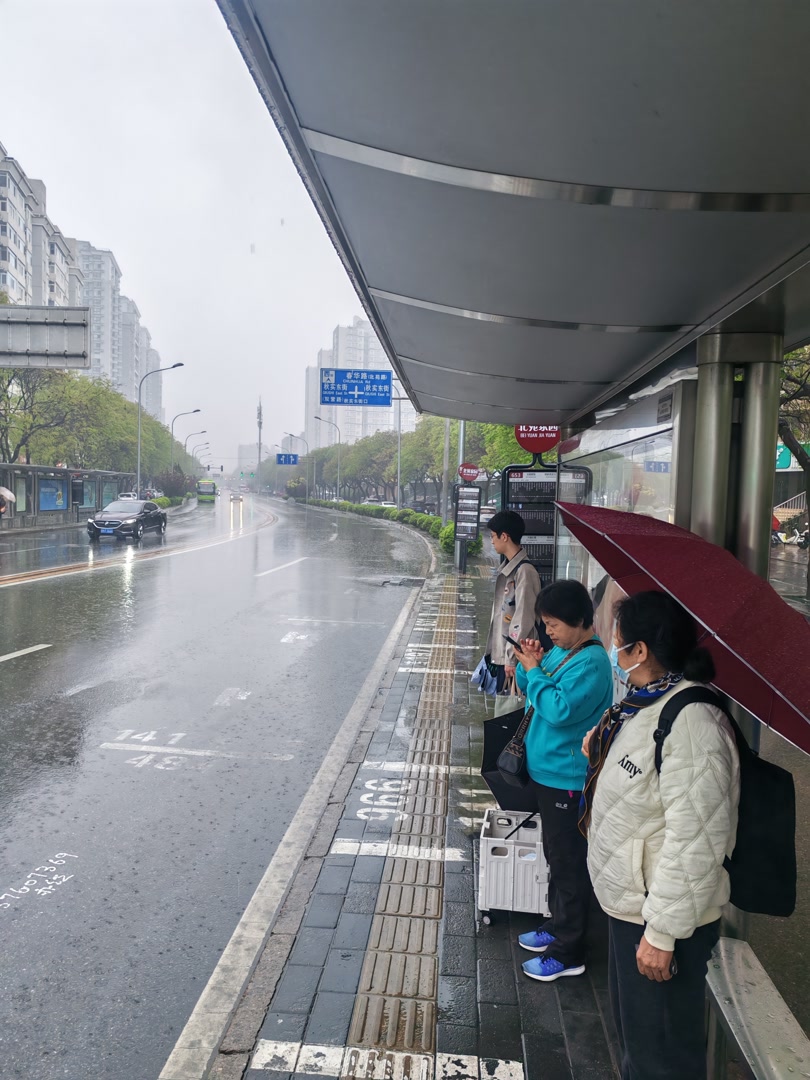 下午2点,雨水淅淅沥沥。北五环外春华路南侧,北苑家园公交站约15米的站台上,不少乘客正在候车亭等车,这里有141路、466路、484路、653路、621路、专107路、专81路等车次。而在路北公交站,候车亭却比南侧“短”了约一半,除了一名阿姨打着伞在雨中候车,更多的乘客,“挤”在旁边几米的候车雨棚下。