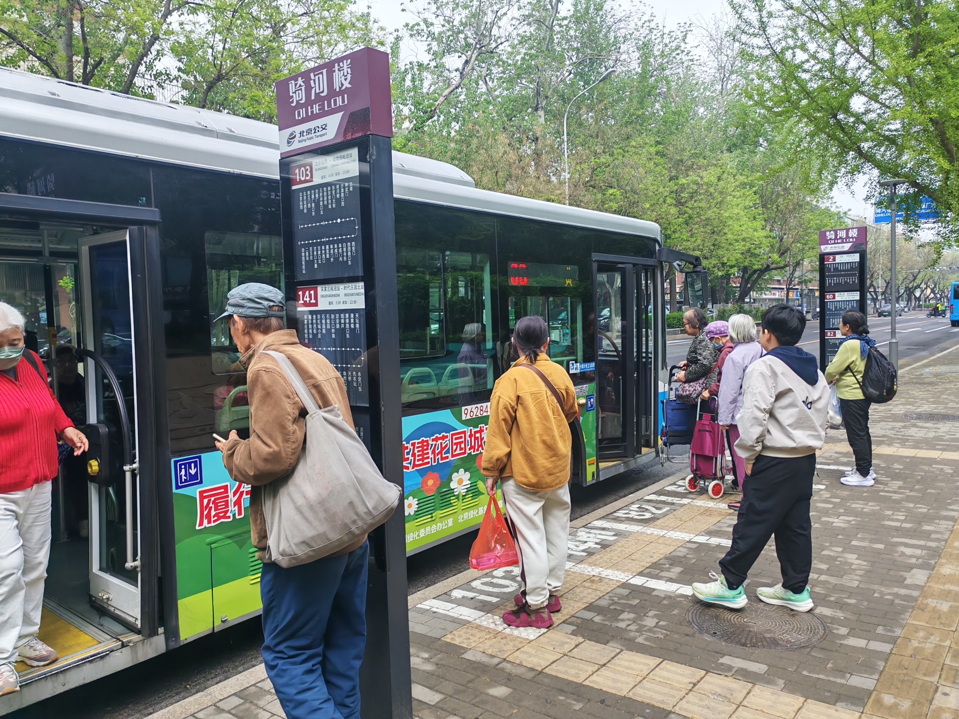 骑河楼公交站主要有103路、60路、141路、82路、2路等车次。当天,候车乘客主要是附近居民和周边旅游的人。张女士走后,一手拄拐、一手拎东西的莫大爷也来到站点候车。大爷在现场站立了两三分钟,就把拐杖扔在一边,在站台后方的路缘石上坐了下来。大爷走后约十分钟,一名中年男子在候车时,同样坐在了路缘石上。