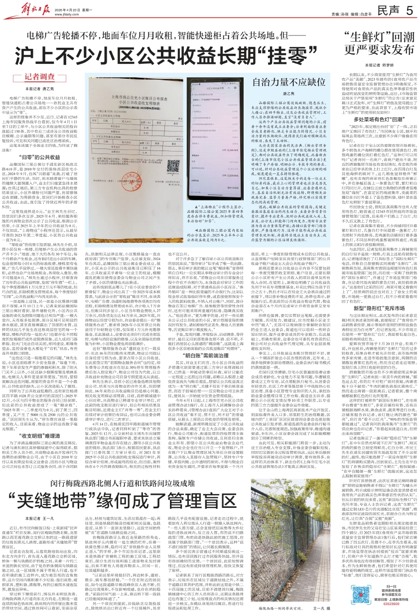 这样的怪象并不少见。近日,记者在12345上海市民服务热线平台看到,仅今年4月1日至7日的工单中,与小区公共收益相关的投诉就超过150条,其中有近三成涉及公共收益账目模糊、公示逾期等问题,甚至有部分市民反复投诉,可见相关问题已成社区治理顽疾。