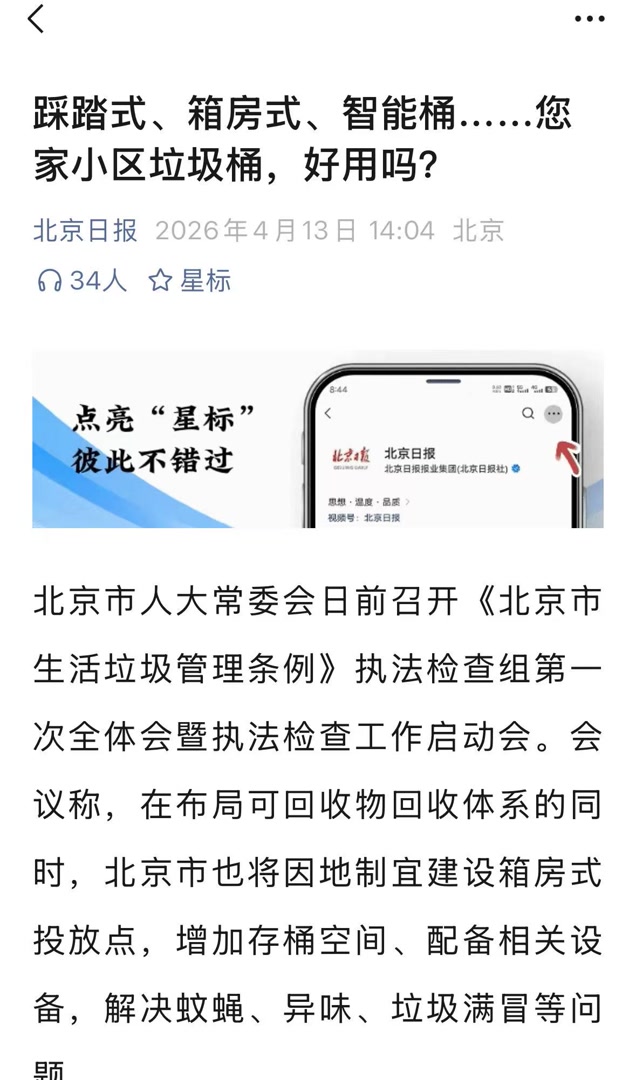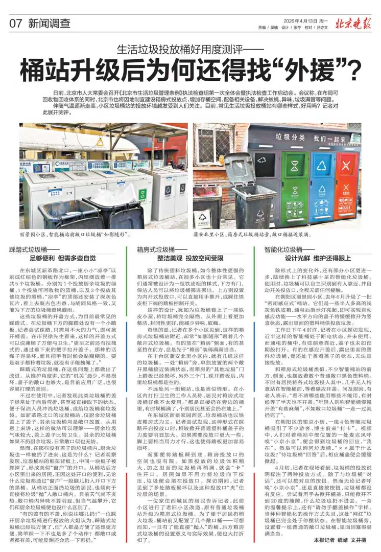 4月13日,北京日报客户端以北京箱房式垃圾桶都好用吗? 智能桶为何遇冷?亲测——为题,对街头巷尾的生活垃圾投放桶进行好用度测评。呈现了一些垃圾投递不力、挡板踏板损坏、智能桶无法使用等问题,以及密闭垃圾桶前,总是“配套”摆放着几个敞口桶的怪象。报道刊发后,市城市管理委立即组织相关部门针对问题展开整改,目前已全部整改完毕。