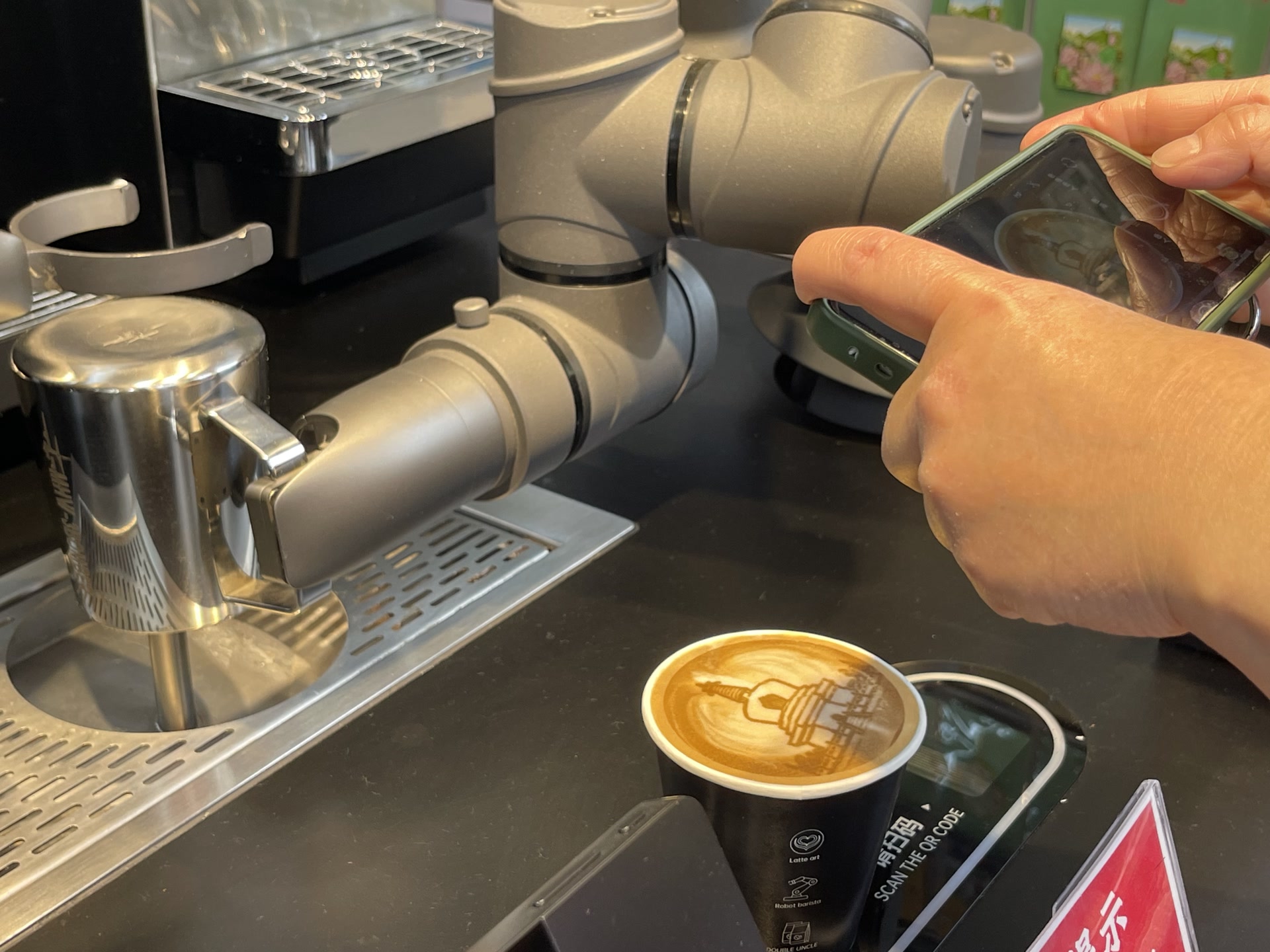 机器人右手为五指灵巧手,左手为夹爪。刚好赶上第二杯半价活动,一位女士扫码下单后,机器人立刻启动工作:用夹爪取杯、放置到位,再用手指按下机器按键,一分半钟就完成了咖啡制作,平稳送至取货口。