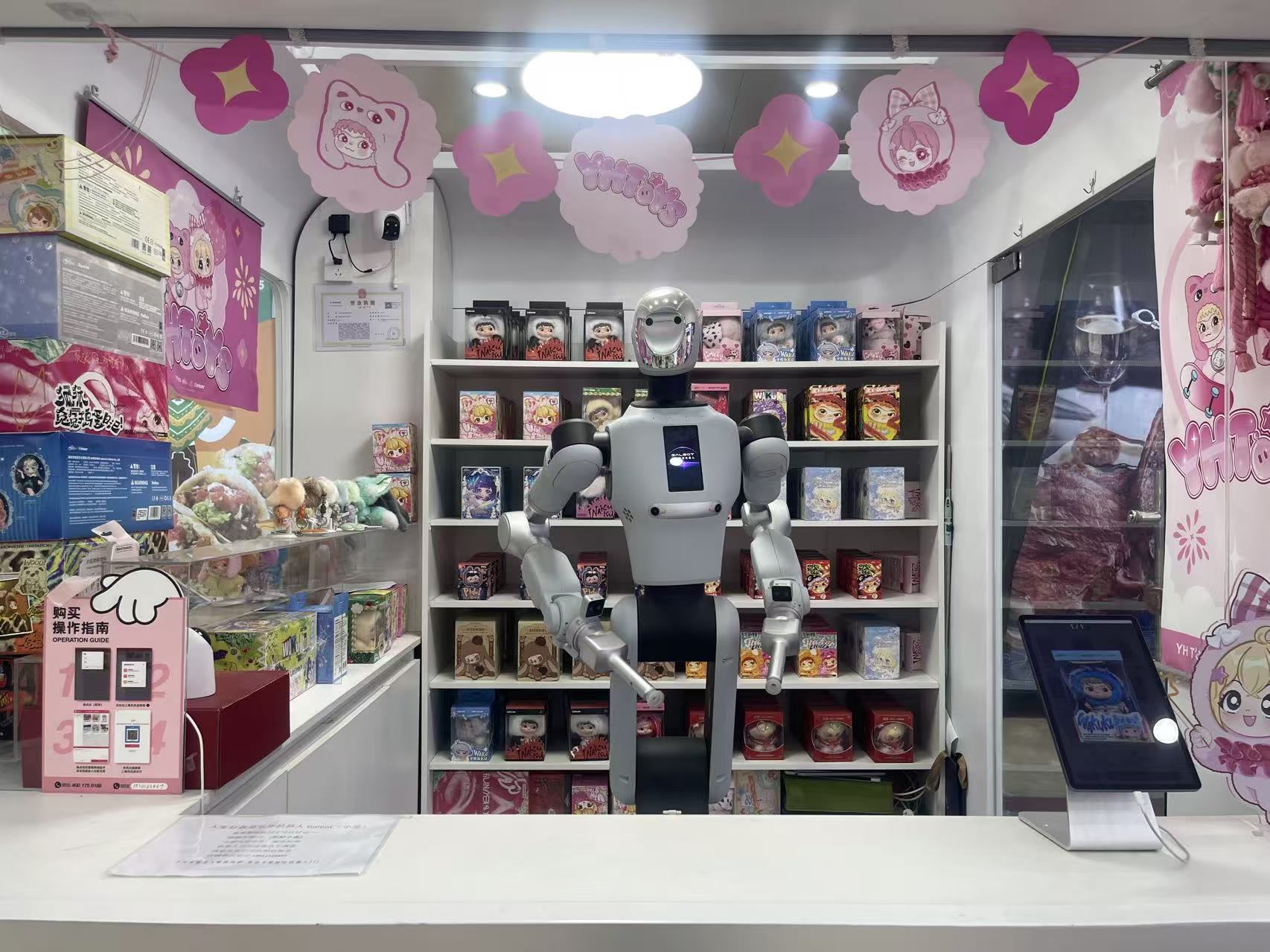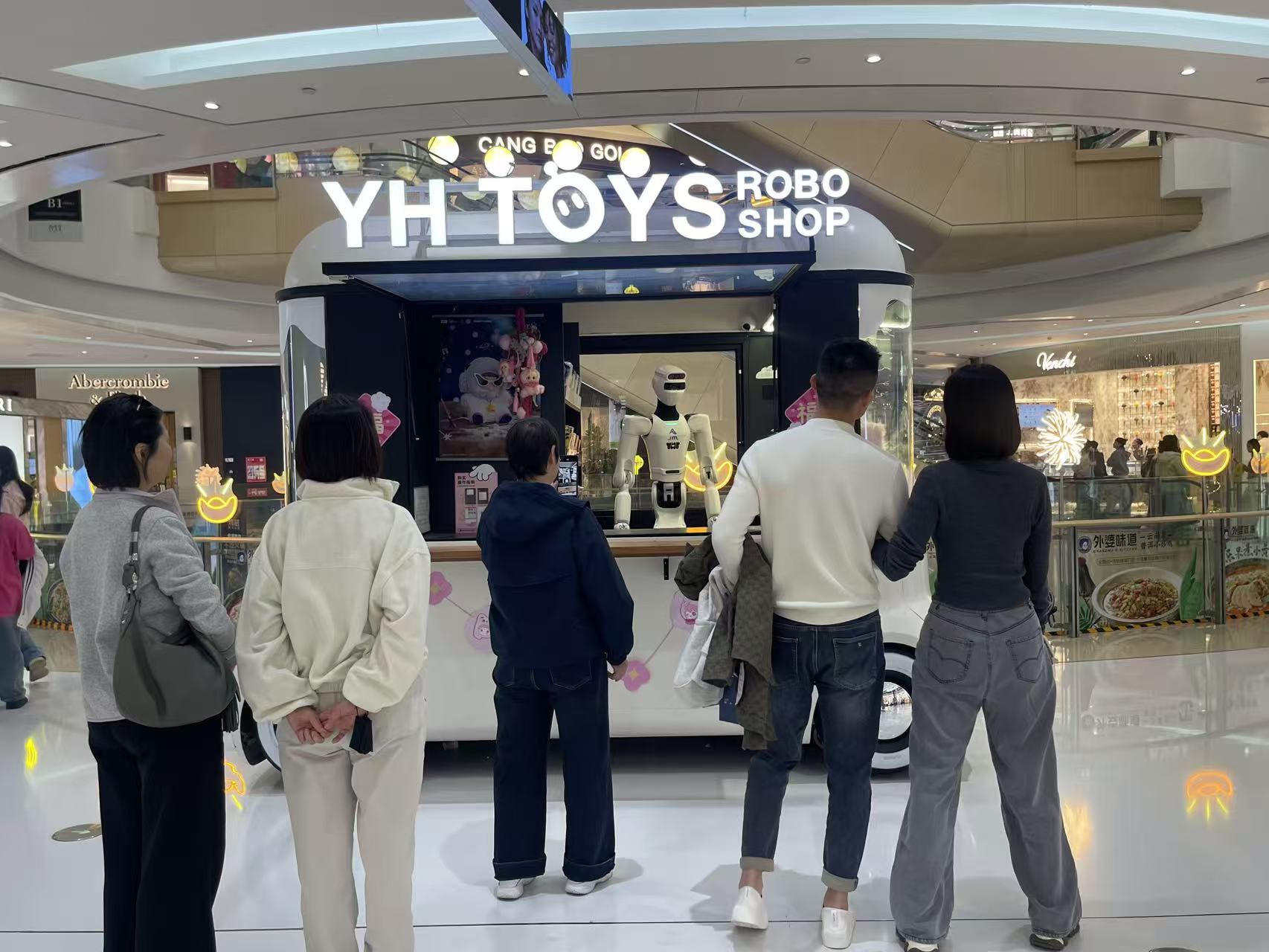 五棵松地铁站通往华熙LIVE商业街的地下空间,名为“YH TOYS ROBO SHOP”的潮玩盲盒售卖空间格外惹眼。窗口前,围拢着几名年轻人,正好奇打量一台具身智能机器人——它会挥手打招呼、唠嗑聊天,远远看上去科技氛围拉满。