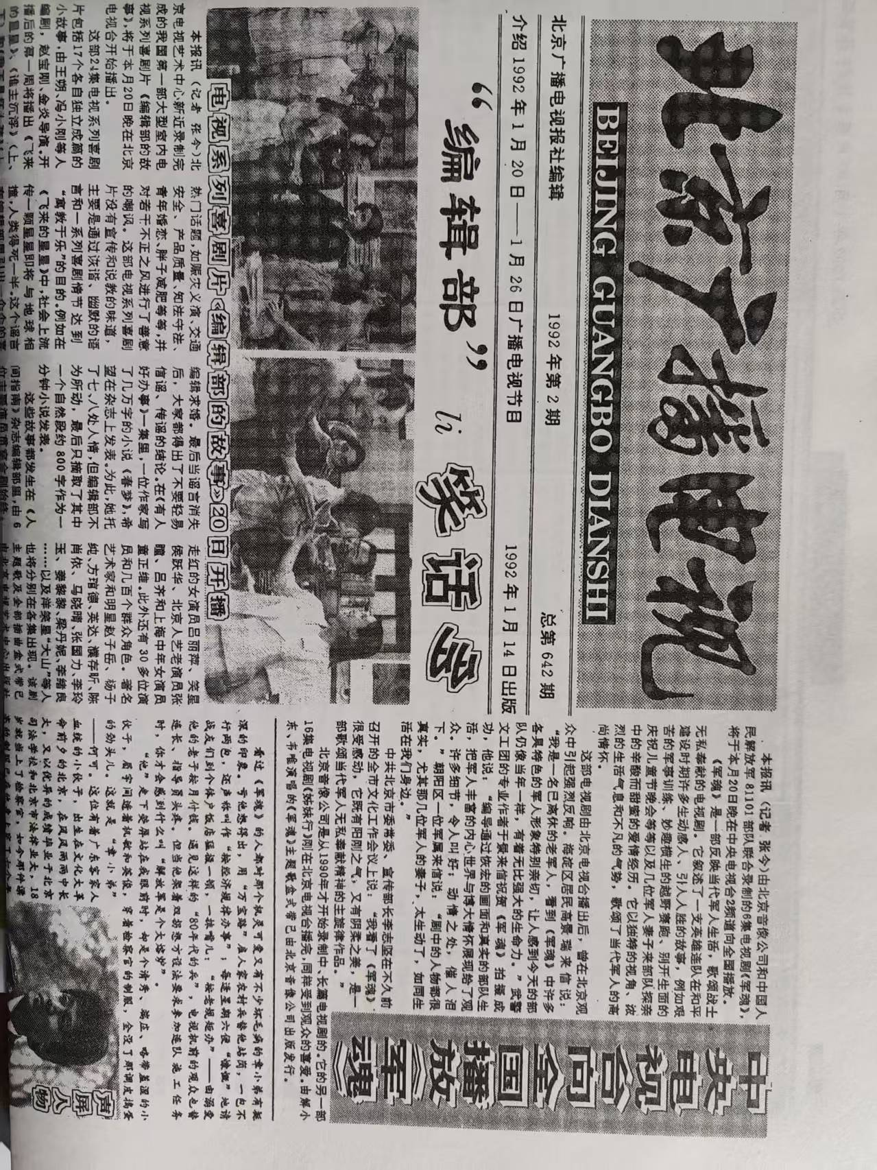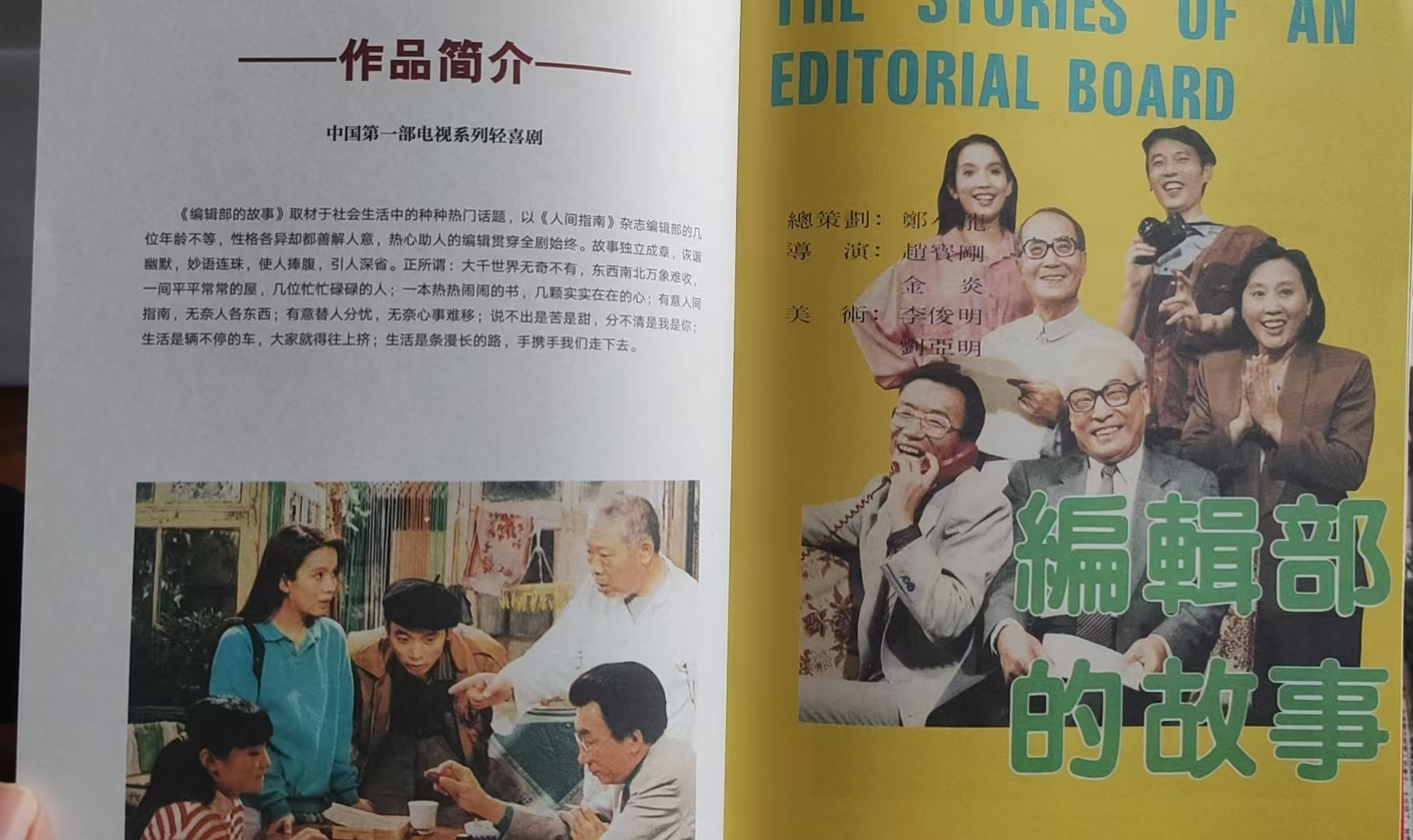 三十五年前,一部名叫《编辑部的故事》之情景喜剧,在北京电视台与广大观众见面了。那时节,或许没有谁会想到,这部长达25集的电视连续剧,居然开创了中国情景喜剧的新时代。三十五年过去,那个叫做《人间指南》的编辑部,早已遁入人们记忆的深处。《人间指南》的那些“老中青编辑”们,也都已过了离退休的年岁。而今,一部厚重的《编辑部的故事(电视剧本珍藏本)》问世了。翻开这本沉甸甸的剧本集,仿佛梦回三十五年前的电视剧开播年代。这部珍藏本的编者是有心人,他们将这部书的内容,延展得很宽:一册精心设计的《人间指南》杂志(第一期),也就是《编辑部的故事》背景故事集,随着珍藏本一道问世。与此同时,刊载这部电视剧开播消息的《北京广播电视报》(1991年某期。在这份报纸里,居然还有城乡贸易中心开业的消息)也被完整复印;与播出内容有所不同的原始剧本(台词复刻本),也被复印出来(很有趣的是,在最初的剧本里,李冬宝是想从《人间指南》编辑部跳槽到《大众生活》编辑部去的)。