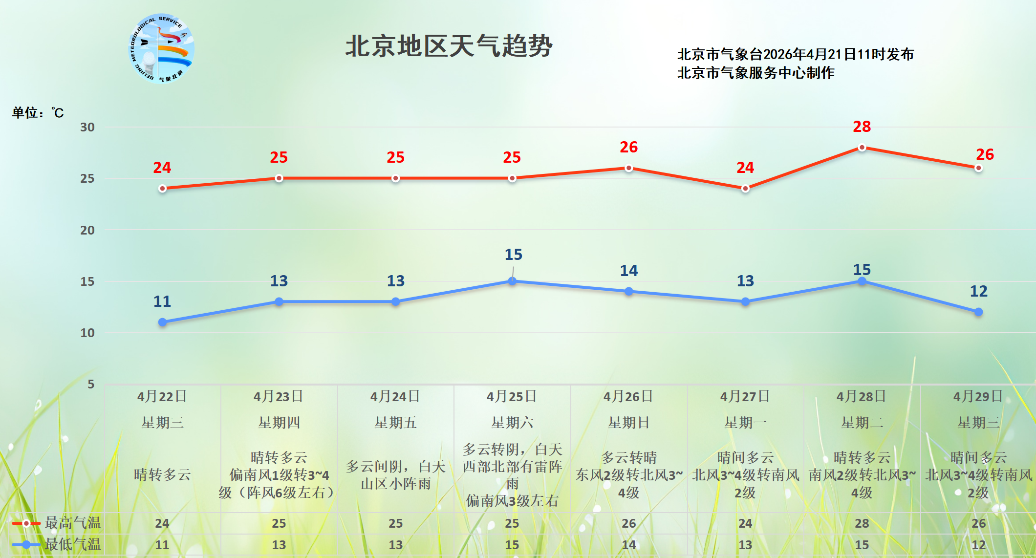 今天北京天气舒适,春和景明好风光,午后偏南风渐起,阵风可达五级左右,预计最高气温在25℃上下,天气还是很适宜大家户外活动的。