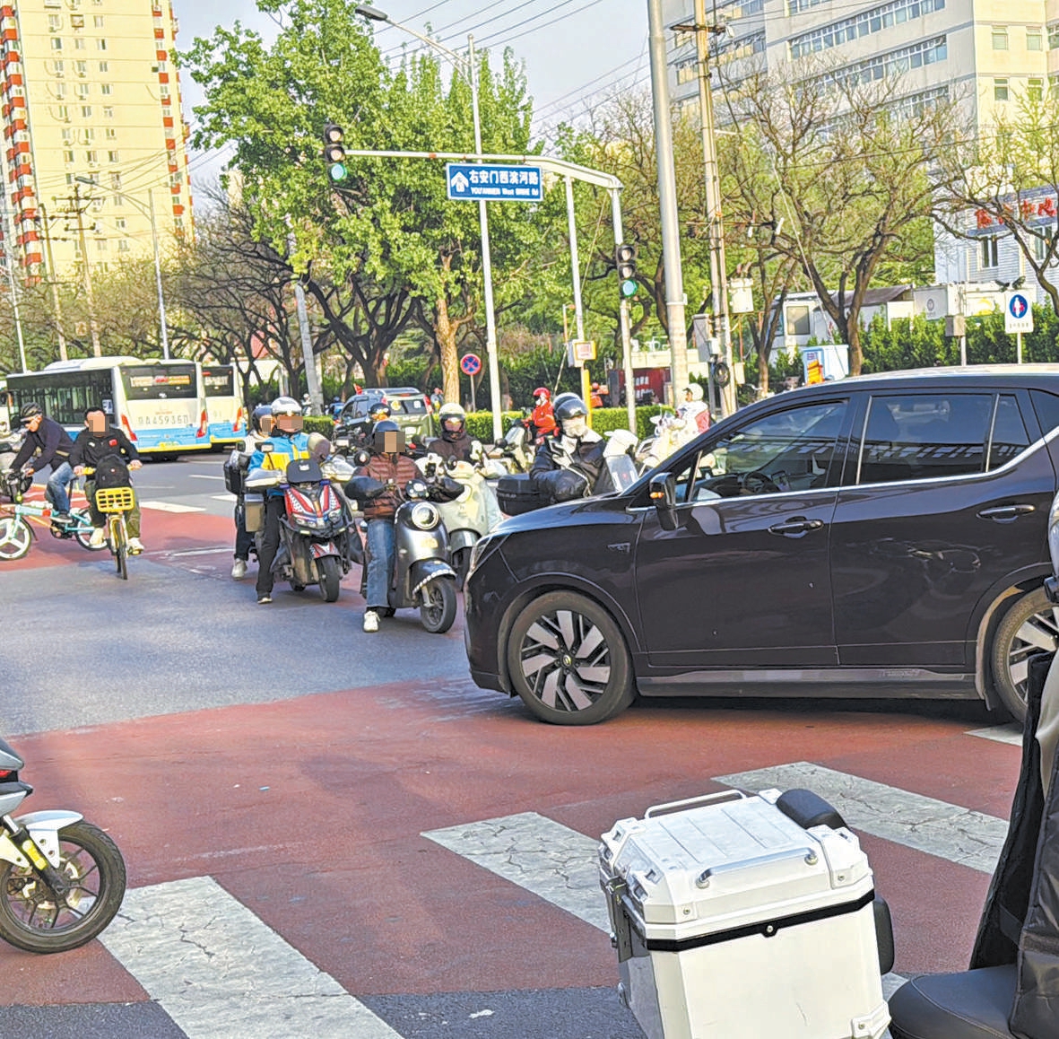 晚高峰时记者观察发现,右安门西滨河路东向西非机动车的车流量不算太大,只需很短时间,在路口等红灯的车流就能“消化”干净。让大多数非机动车先走,并不会导致左转车辆长时间受阻。而真正耽误时间的,是机非“顶牛”的情况——狭路相逢,骑车的人脚踩地了,开车的人刹车了,两方都以为对面让步了,又不约而同都往前蹭了一步,结果各吓一跳,又都停了车。如此反反复复,试探对方的勇气和车技,既耗时间又容易发生交通事故。