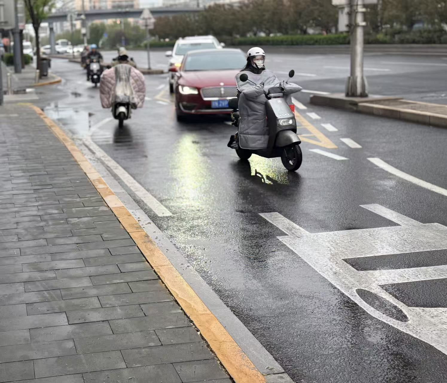 然而新问题来了,非机动车道被拦死了,很多本可以直接右转的骑车人等得不耐烦,就把车往右一拧,绕开铁栅栏骑到了机动车右转的那条道上,于是机非车辆就产生了第二次交会。