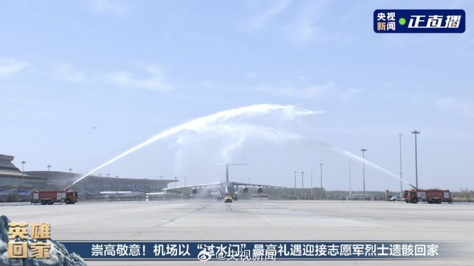 今天,接迎第十三批在韩志愿军烈士遗骸的运-20B专机飞抵沈阳桃仙国际机场。专机降落后,机场以“过水门”最高礼遇迎接英雄回家。