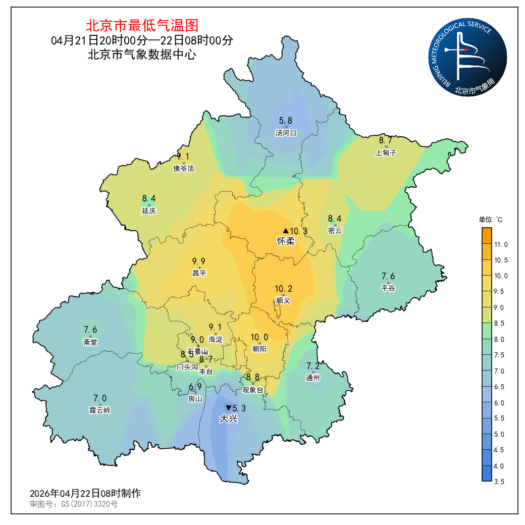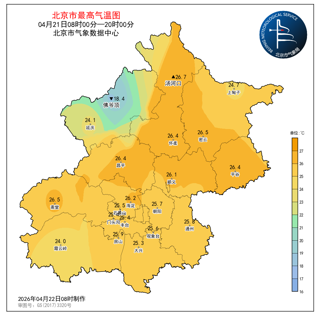 4月21日08时至4月22日08时,观象台最高气温25.6℃(14:34),最低气温8.8℃(5:20)。