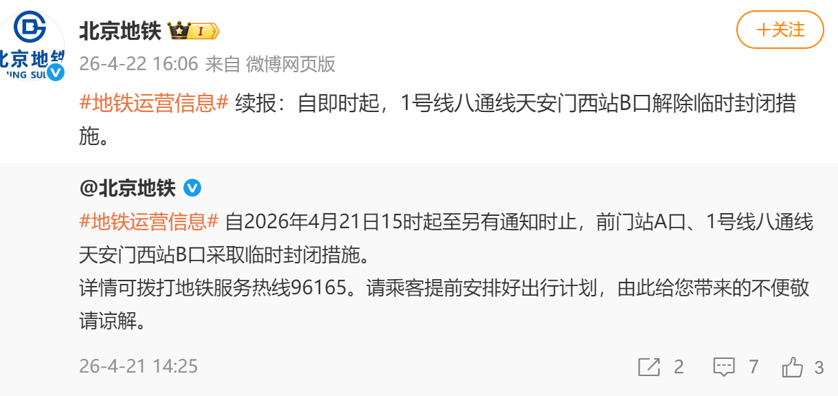 地铁运营信息续报:自即时起,1号线八通线天安门西站B口解除临时封闭措施。