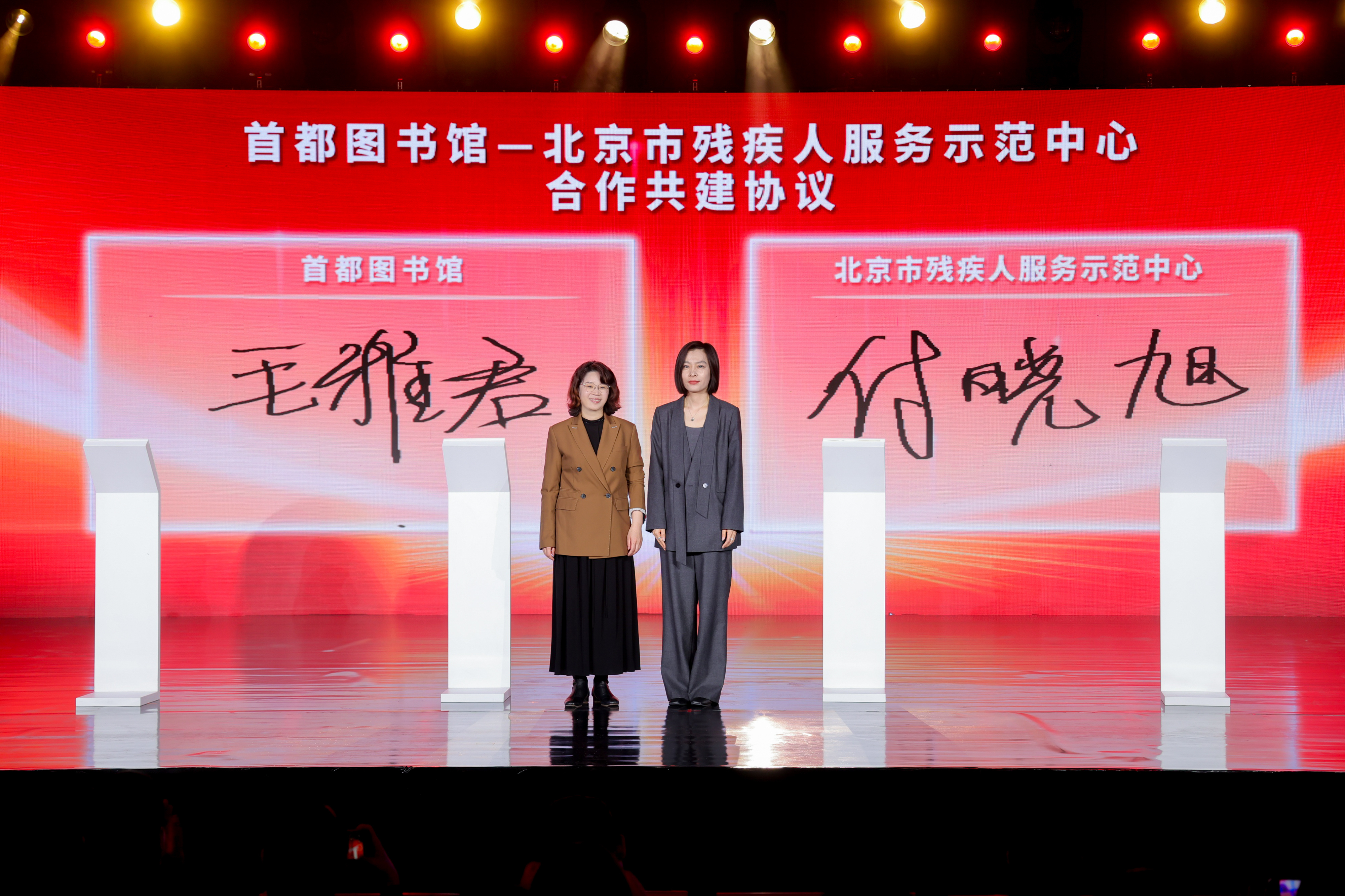 首都图书馆馆长毛雅君(左)与北京市残疾人服务示范中心副主任付晓旭(右)签署《首都图书馆 北京市残疾人服务示范中心 合作共建协议。