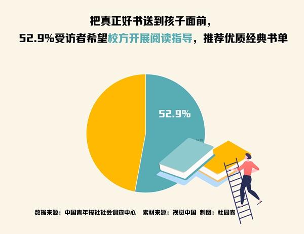 把好书送到孩子面前,让孩子爱上阅读,52.9%的受访者期待学校开展阅读指导,推荐优质经典书单。