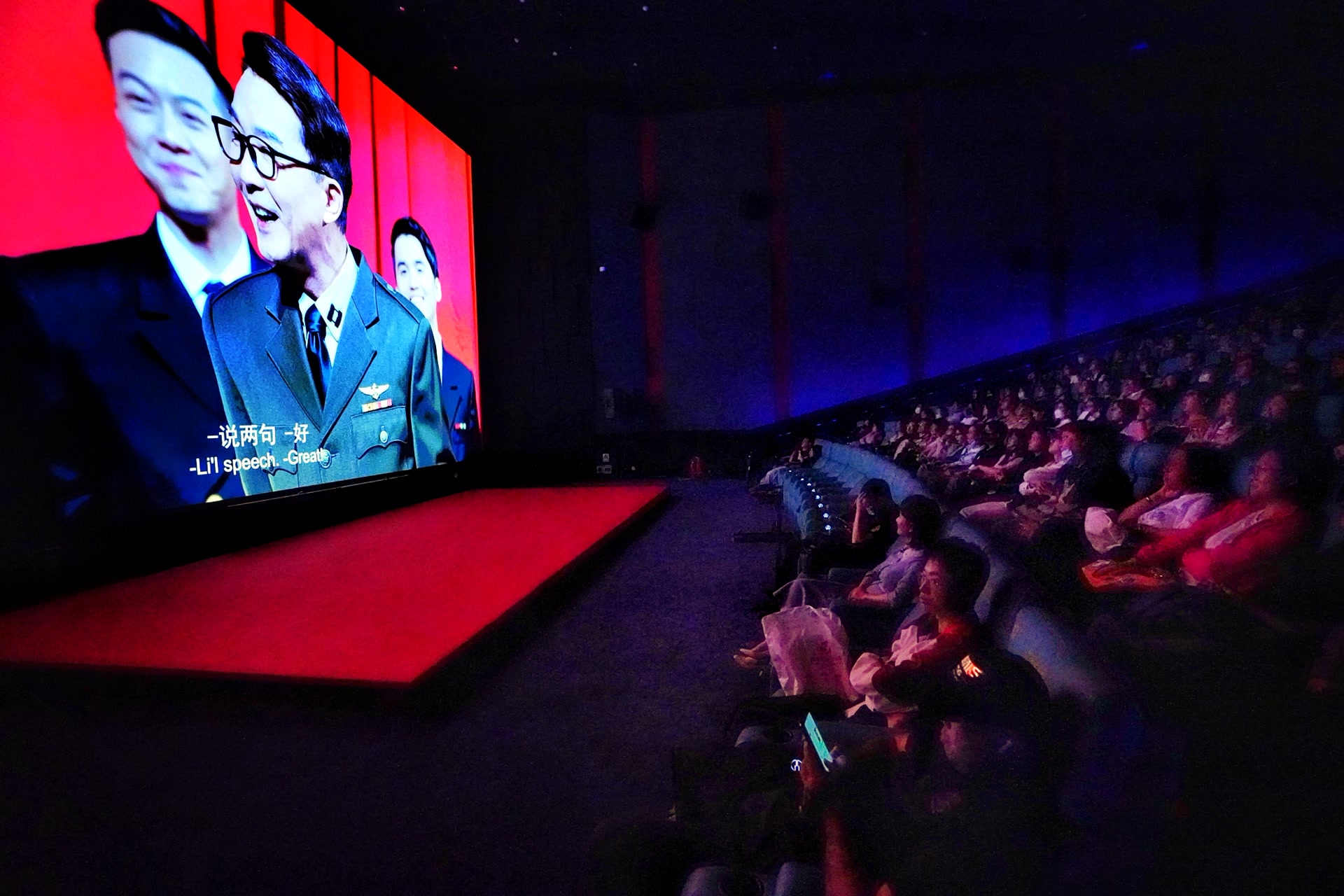 戏剧电影《哗变》,在单纯的舞台记录与电影美学之间寻找平衡,场景和调度忠实保留戏剧舞台的样貌,但分镜头语言详细而有节奏感,捕捉了许多在剧场里难以“逼视”的演员的细微表情、精准动作与舞美细节,还原出《哗变》独有的震撼人心的“台词风暴”。同时,戏剧电影并不回避“穿帮”,它刻意保留了打向演员的灯光、后台的通道、全场观众静默专注的目光以及首都剧场那方舞台的“镜框”,留存戏剧骨子里的“假定性”。