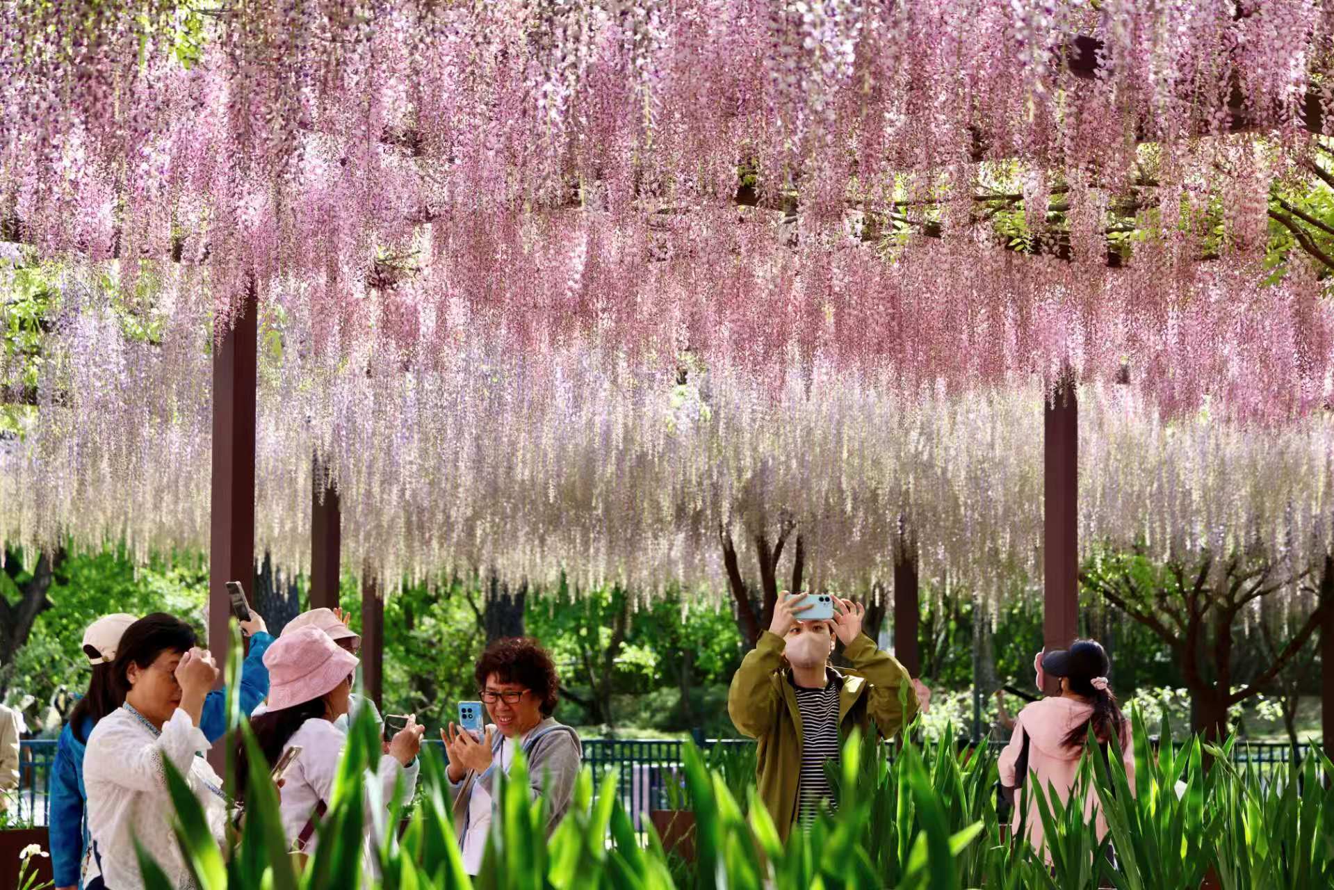 据园方介绍,紫藤主要分布在三个区域:西北部的科普广场是开花密度最高、视觉冲击力最强的核心观赏区,这里集中了3个色系、6个品种的多花紫藤,花穗自然下垂,最长可达一米,并搭配同期盛开的鸢尾;东南部的玉渊春秋景区以藤架长廊为主,适合漫步穿行;南部的樱珞花谷景区则结合园路和地形,以廊架和树状相结合的方式展示。