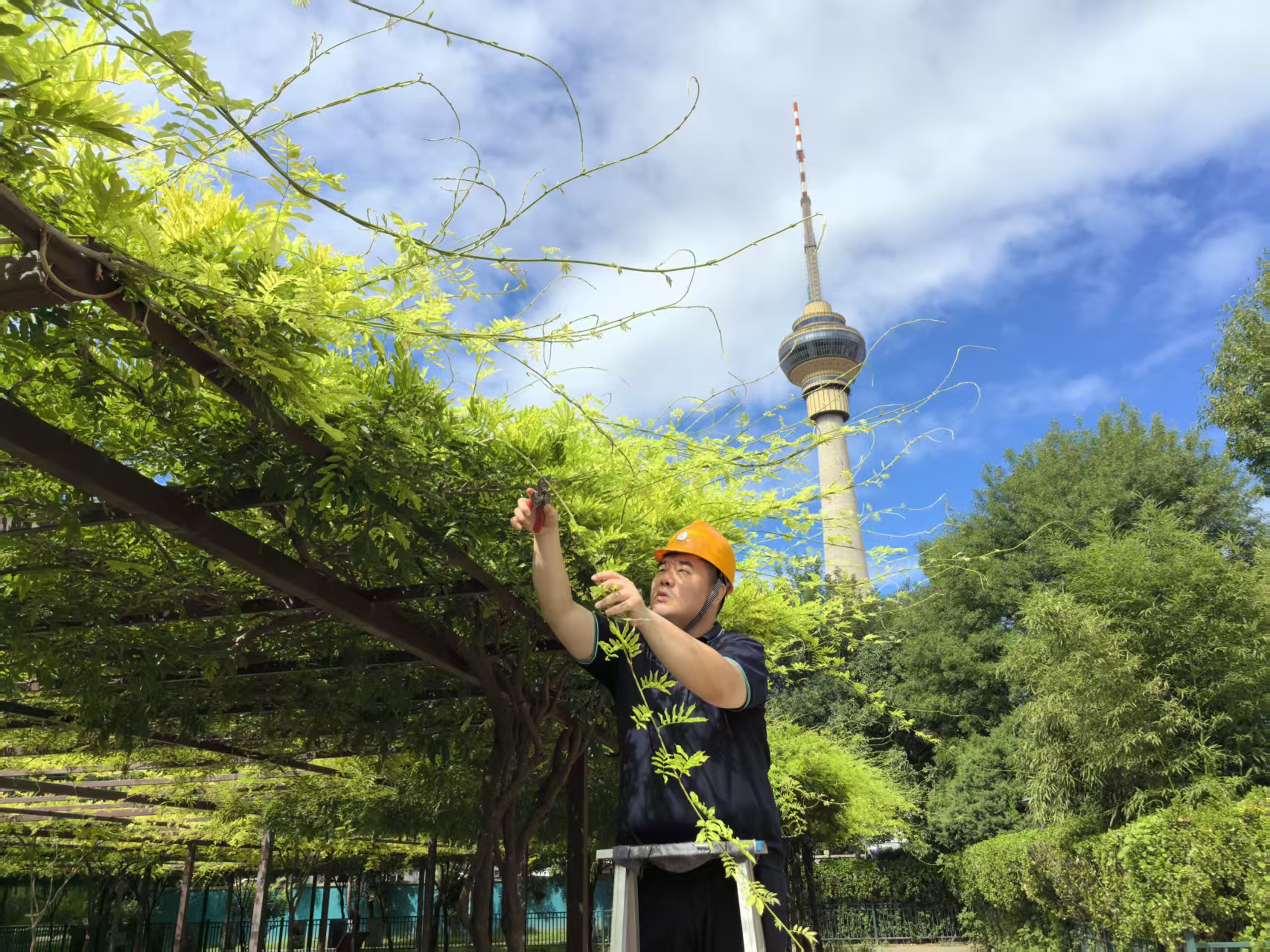 “要想让紫藤达到震撼的观花效果,每年三次大规模的修剪必不可少。”据申俊彪介绍,每年紫藤的第一次修剪在开花以后,要从花穗根部往下数三棵芽,在其下方1厘米处剪断。这样的工序,每个花穗都要重复一遍,对修剪手艺和体力都是巨大的考验。
