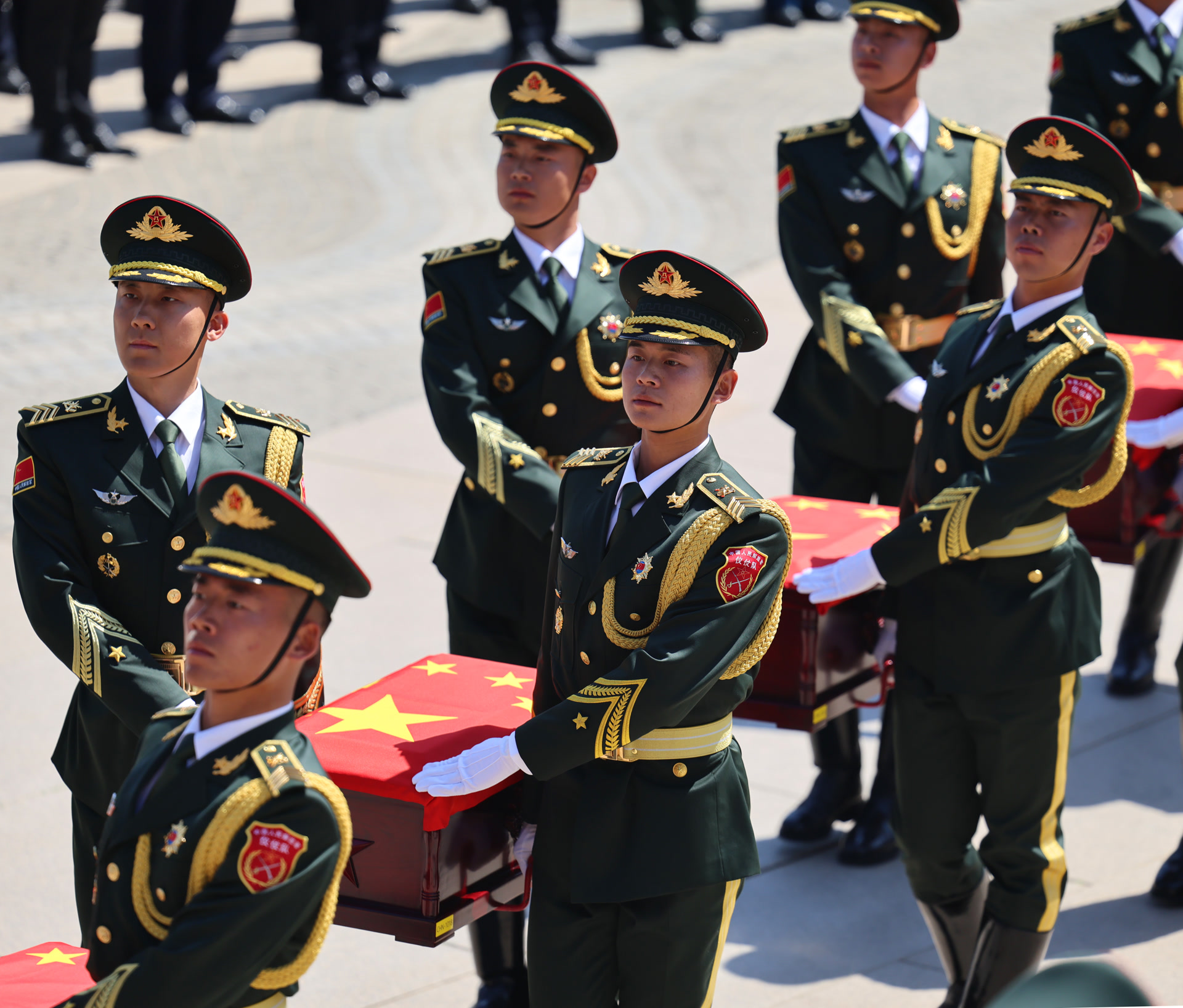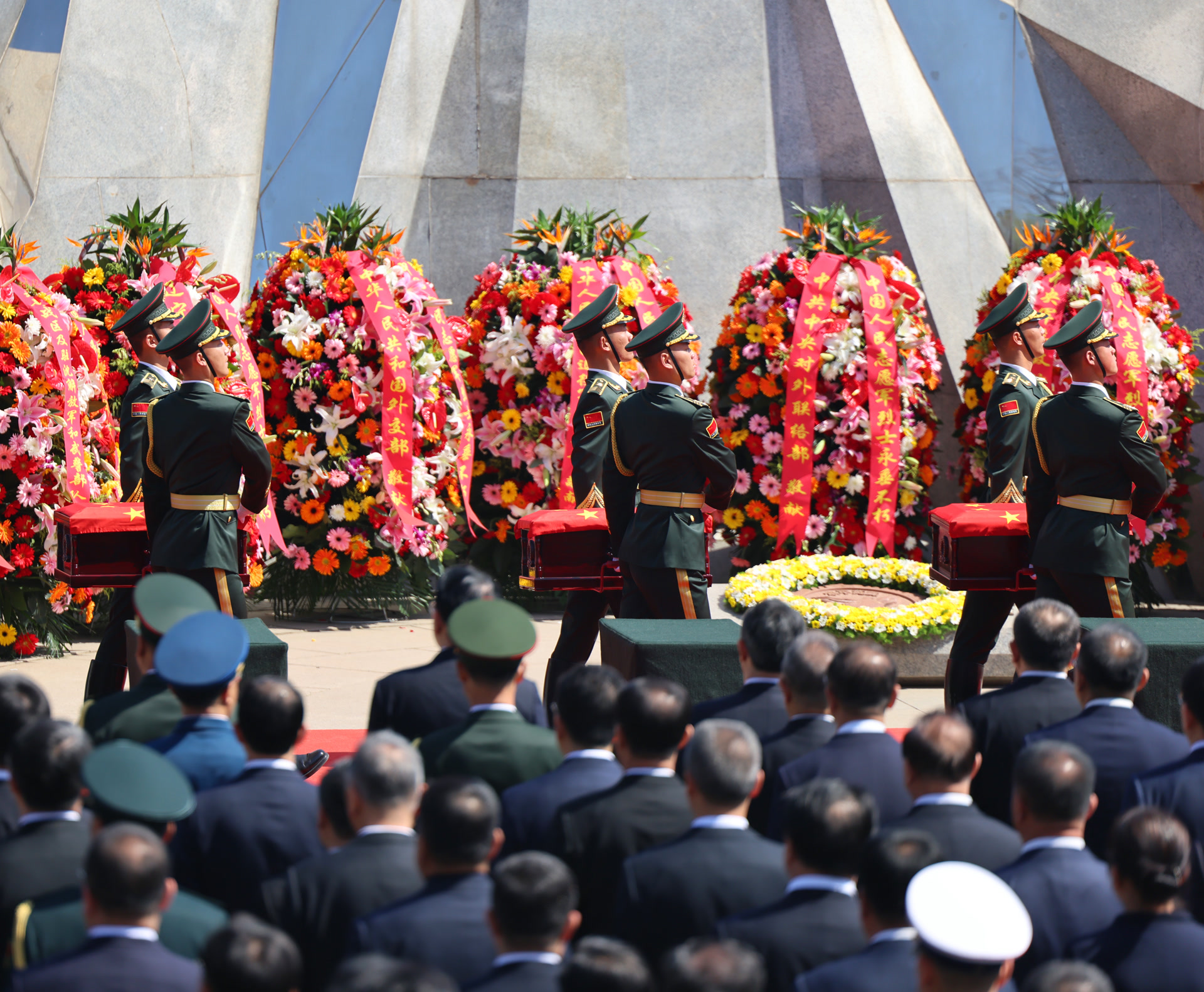 10时许,仪式正式开始,军乐队奏响悠扬的《思念曲》。礼兵在仪仗官兵持枪护卫下,护送志愿军烈士遗骸棺椁缓步进入纪念广场,全场肃立,奏唱中华人民共和国国歌。致祭文后,现场全体人员向志愿军烈士遗骸垂首默哀,并三鞠躬。27名礼兵连续鸣枪12响,向英烈致以崇高敬意。
