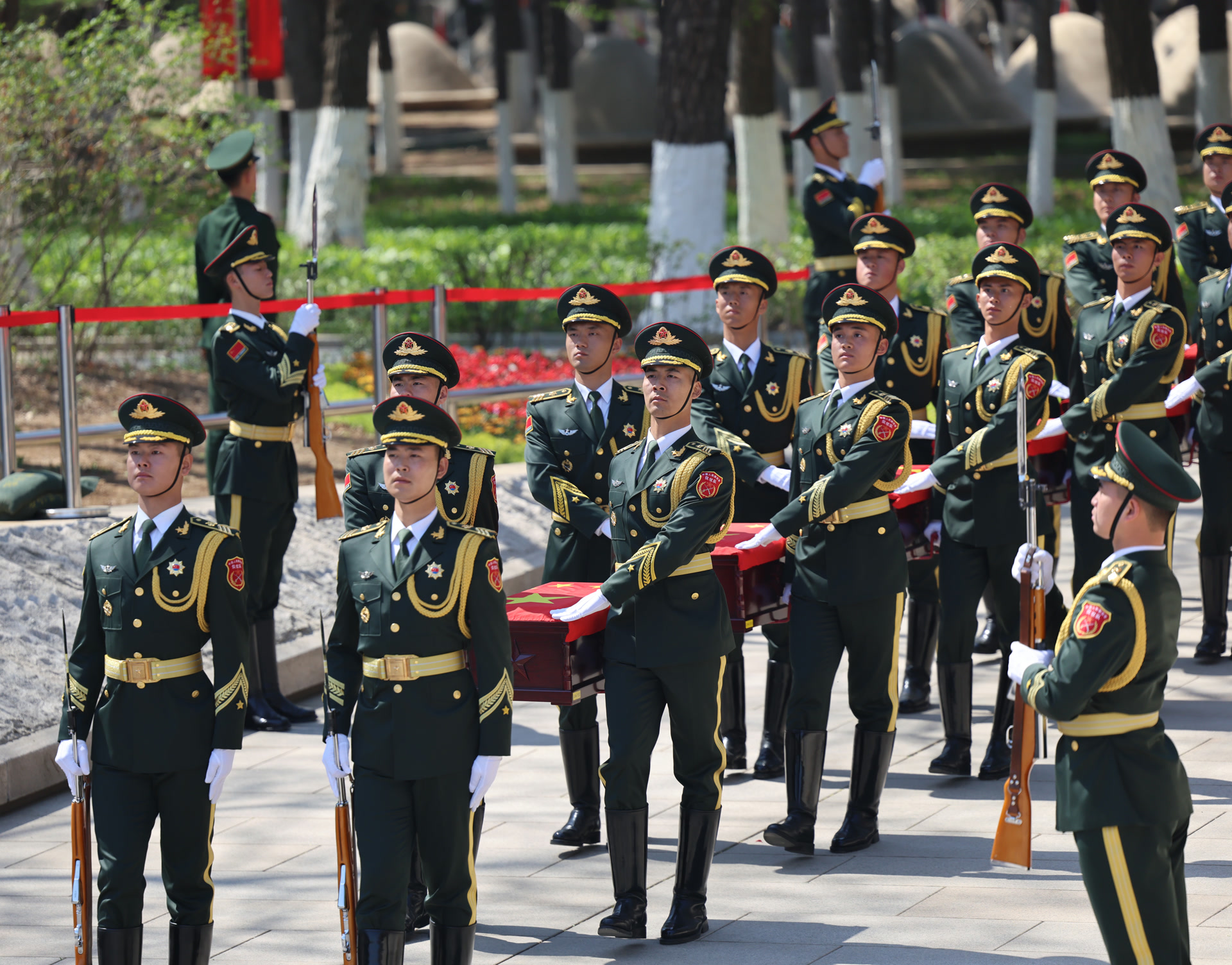 《思念曲》再次响起,礼兵护送烈士遗骸棺椁前往安葬地宫。全体人员肃穆礼送,依次向烈士献花、瞻仰烈士英名墙。