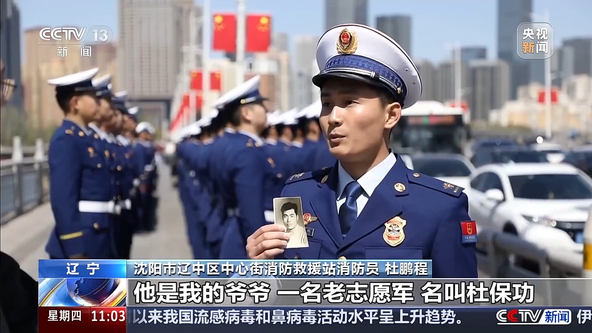 沈阳市辽中区中心街消防救援站消防员 杜鹏程:这张照片我一直都随身携带着,他是我的爷爷,一名老志愿军,名叫杜保功,他18岁便去了朝鲜,参加抗美援朝。今天我替去世的爷爷来到这里,接他的老战友们回家。这份感觉就像是完成了一份等候了70多年的约定,这份心情不只是接英雄,更是接家人回家。