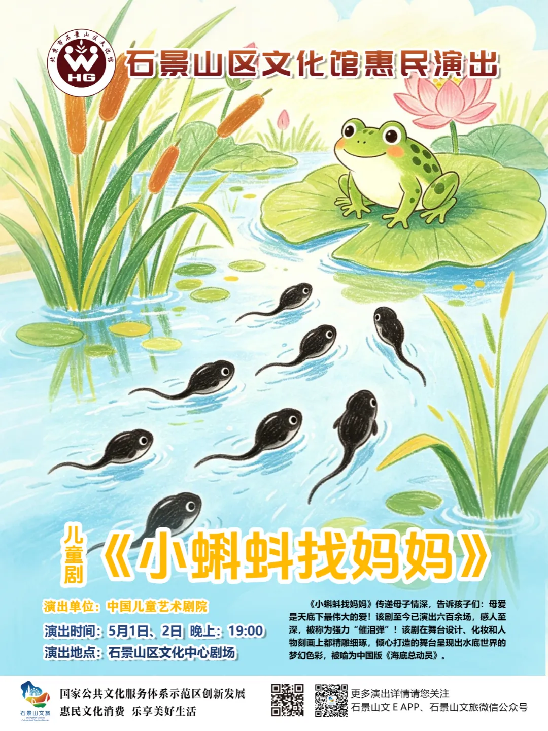5月1日、2日,中国儿童艺术剧院将带来儿童剧《小蝌蚪找妈妈》。神秘的水底世界、只会教八以内算数的螃蟹大叔、可怕的大黑鱼……整场演出中,笑声不断。孩子们看得入迷,大人们也将跟着找回童心。