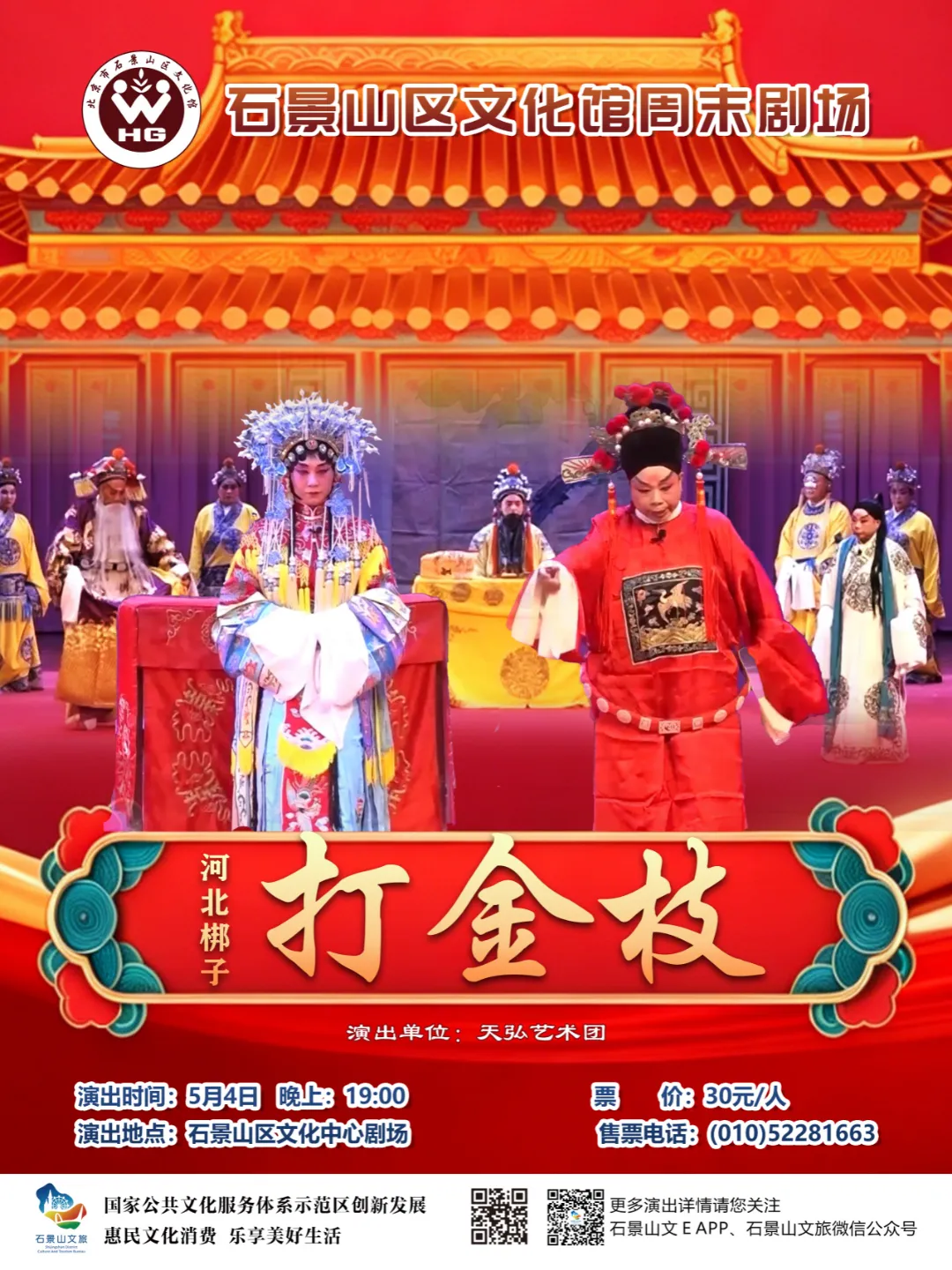 5月4日,天弘艺术团将带来河北梆子《打金枝》。故事讲的是唐代宗将女儿升平公主许配汾阳王郭子仪六子郭暧为妻。时值汾阳王花甲寿辰,子、婿纷纷前往拜寿,惟独升平公主不往,引起议论,郭暧怒而回宫,打了公主。公主哭诉父母,逼求唐皇治罪郭暧,郭子仪绑子上殿请罪……最后怎样收场?来看戏就知道了。
