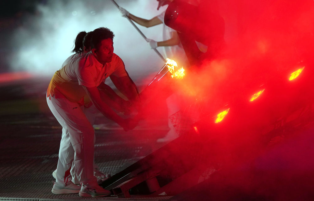 开幕式的点火仪式上,火炬手点燃主火炬塔的瞬间,金色焰火化身展翅鲲鹏的造型腾空而起,将现场气氛推向高潮。“我们使用低烟环保的焰火,融入AR虚拟增强技术,利用电子光和水雾物理反应,既保留震撼的动感,又刻画了绚烂细腻的细节。”亚沙会开闭幕式总制作人王锐祥说,开幕式现场没有明火,在让观众充分感受热情的同时,实现了碳排放降低,传递出绿色可持续发展的理念。