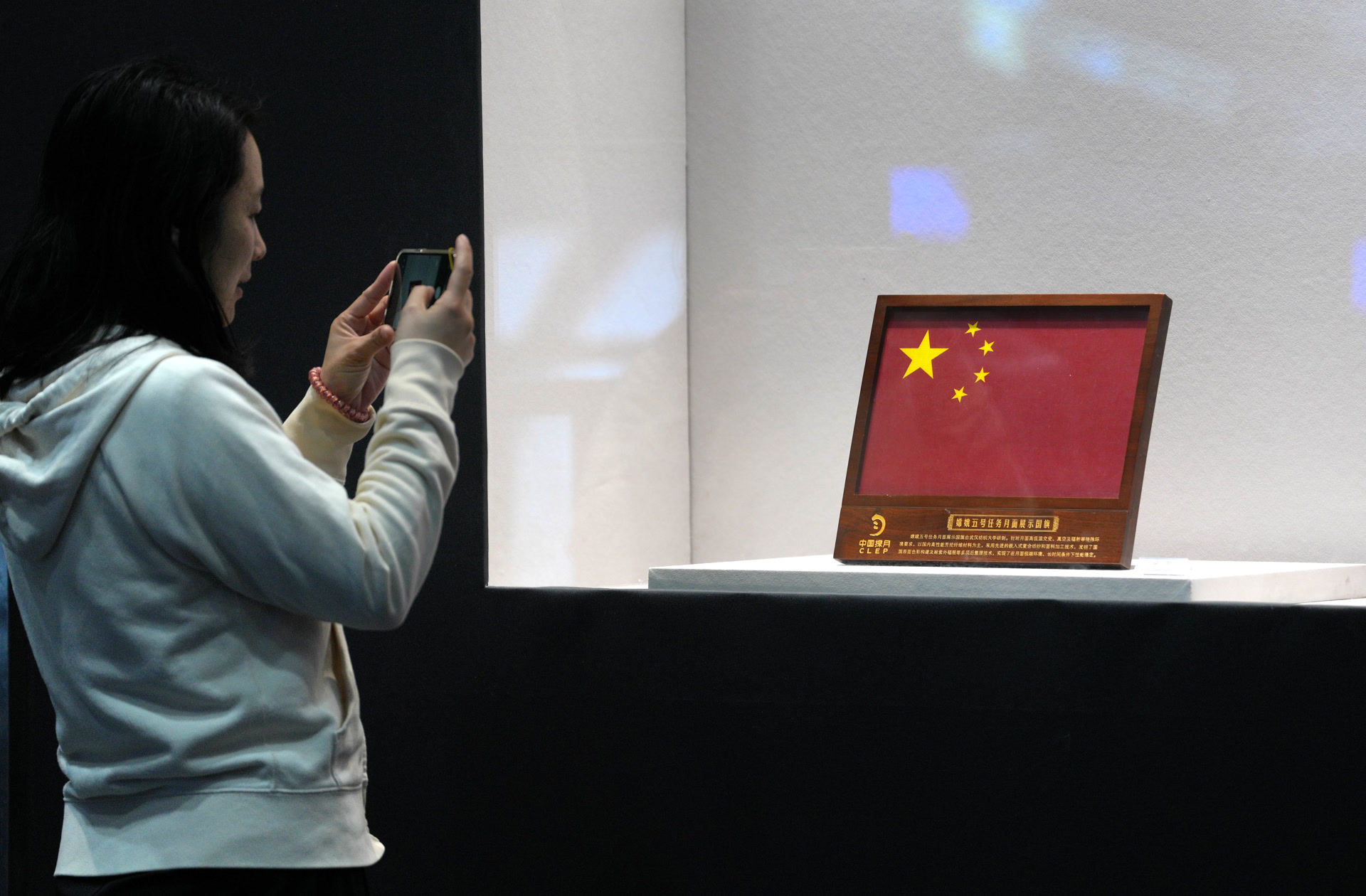 刚进展厅,一面鲜艳的五星红旗格外醒目。它是嫦娥五号任务月面展示国旗。与嫦娥三号、嫦娥四号以及玉兔月球车上的国旗采用喷涂方式不同,嫦娥五号搭载的国旗是一面真正的旗帜。科研团队耗时一年多选材,最终挑选出了二三十种纤维材料,在进行了耐高低温、防静电等各种试验后,决定采用某新型复合材料,使国旗可以抵御月表恶劣环境,不褪色、不串色、不变形。