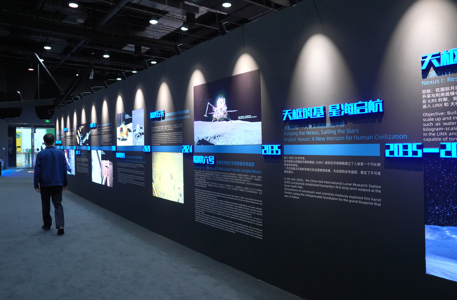 借助VR技术,观众还可穿越至2049年月球南极“天枢”基地,亲历地月轨道转移、太空漫步,直面陨石撞击、太阳风暴等。主创团队表示,相关内容由航天、天文、地质、科普、艺术等多领域专家联合论证,严格依托中国探月工程真实数据与实拍影像创作,实现科学严谨性与艺术感染力高度统一,让观众在沉浸式互动中读懂探月故事。