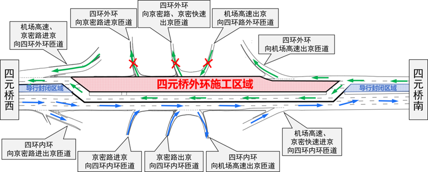 4月25日0时至5时四环主路将实施对向交通导行工作,请过往车辆提前绕行;4月25日5时至4月26日24时实现“分幅占路、对向导行”,届时外环车辆在四元桥区导入对向(内环)行驶。期间,内环匝道不受影响,封闭外环受影响的3条匝道:四环外环向京密路进京匝道、四环外环向京密路出京匝道、机场高速出京向四环外环匝道。