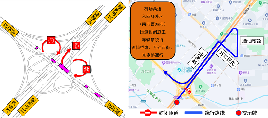 绕行路线:在机场高速出京方向四元桥西设置提示标志,提示车辆沿机场高速向北→酒仙桥路出口驶出→酒仙桥路→万红西街→京密路→四环外环(绕行距离5.1km)