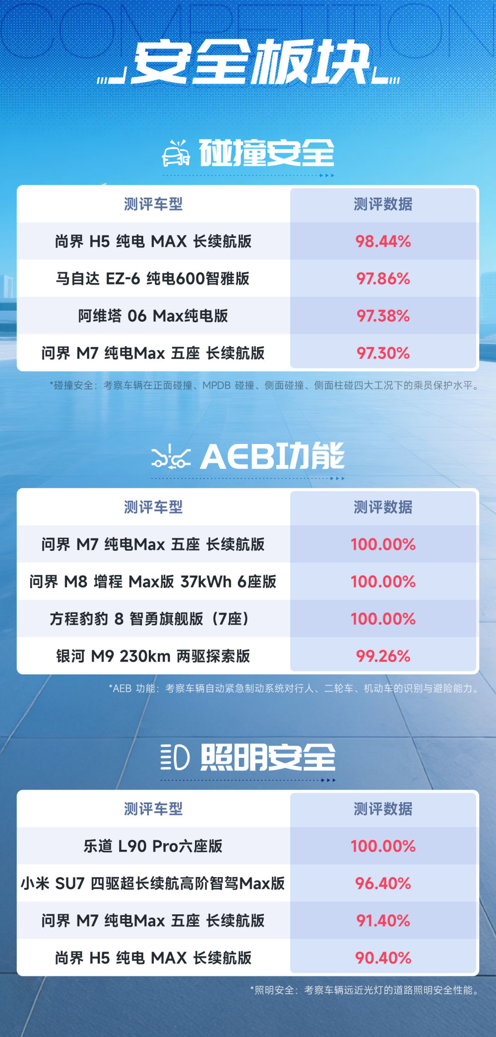 本次筛选了C-NCAP安全测评中碰撞安全、AEB(紧急制动刹停)、照明安全三大细分领域指标,从被动防护到主动避险,全方位考察车辆的安全实力。