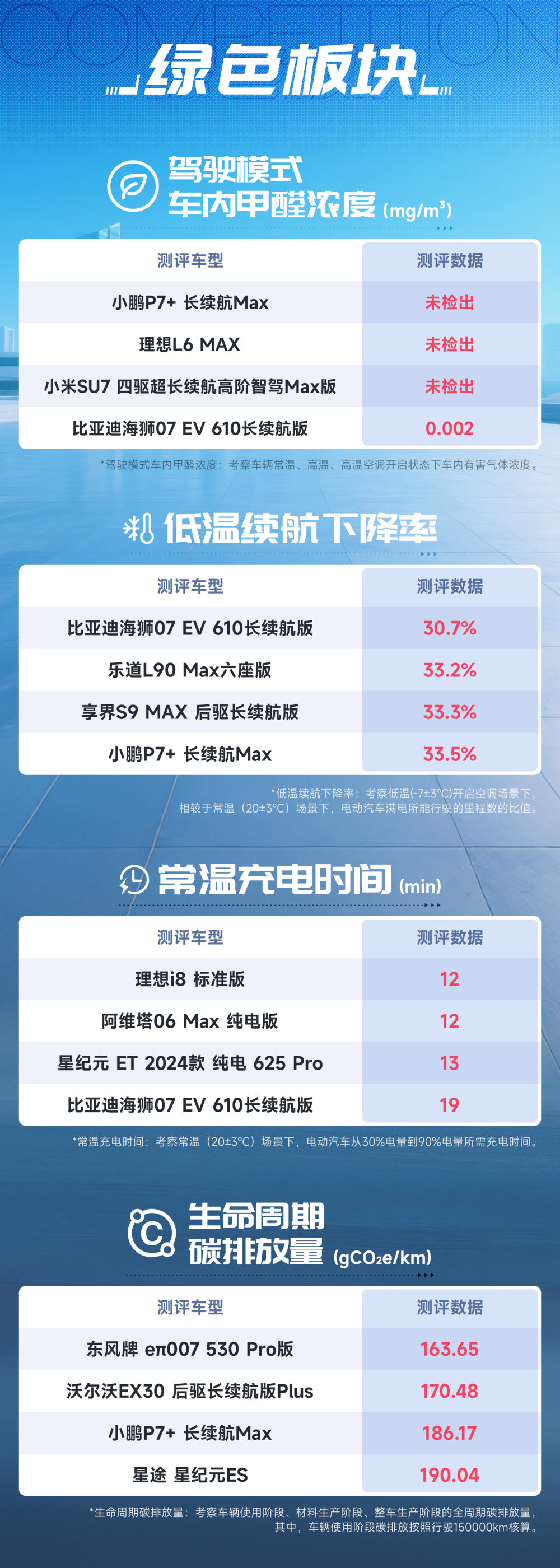 本次筛选的C-GCAP绿色测评指标聚焦车内空气质量、低温续航、常温充电效率、生命周期碳排放量四方面,既守护车内小环境,也助力地球大生态。