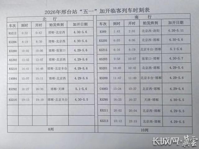 邢台火车站加开临客列车时刻表。