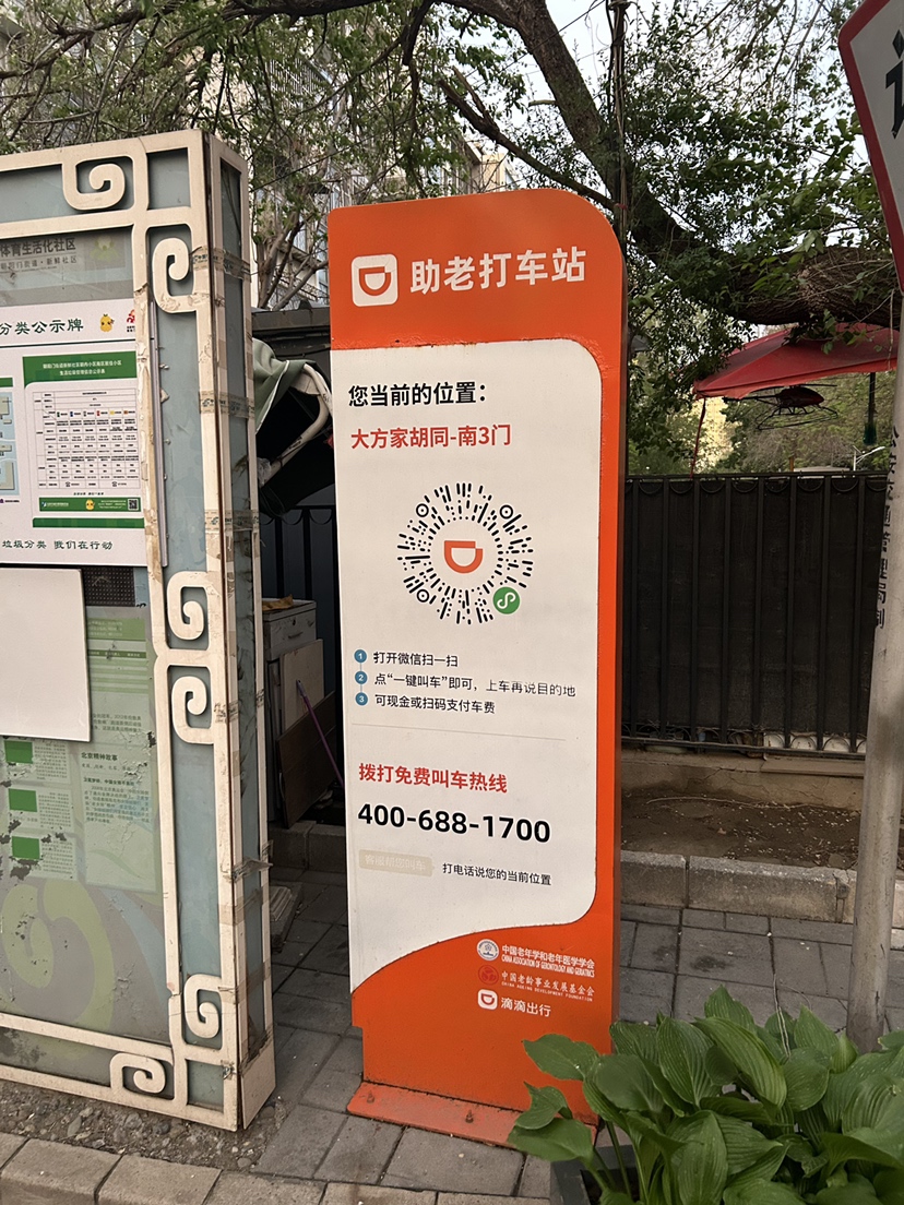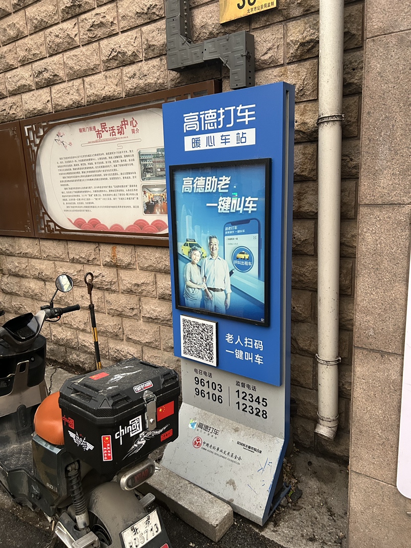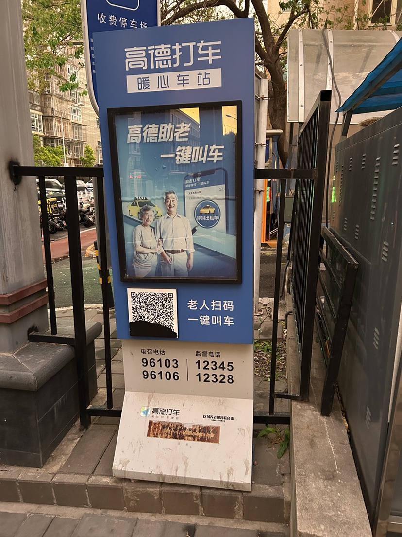 在滴滴助老打车站的对面,大方家胡同南侧的朝阳门街道养老服务中心门外,还有高德打车的“暖心车站”,上面也有一个二维码,扫码后同样是一键呼叫出租车的页面,叫车流程也相同。