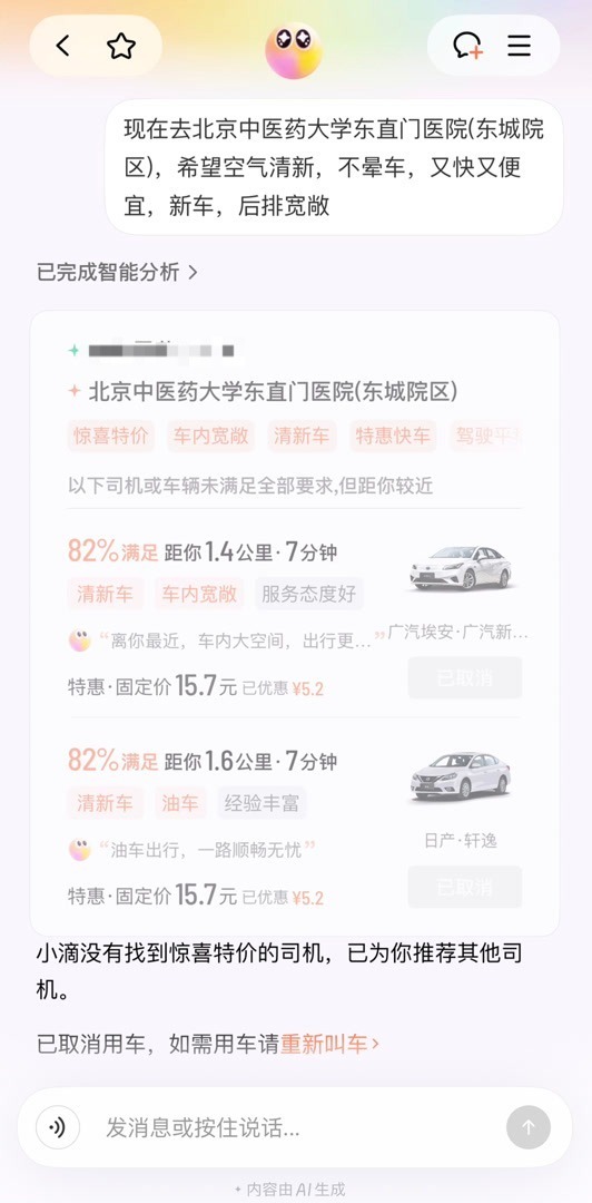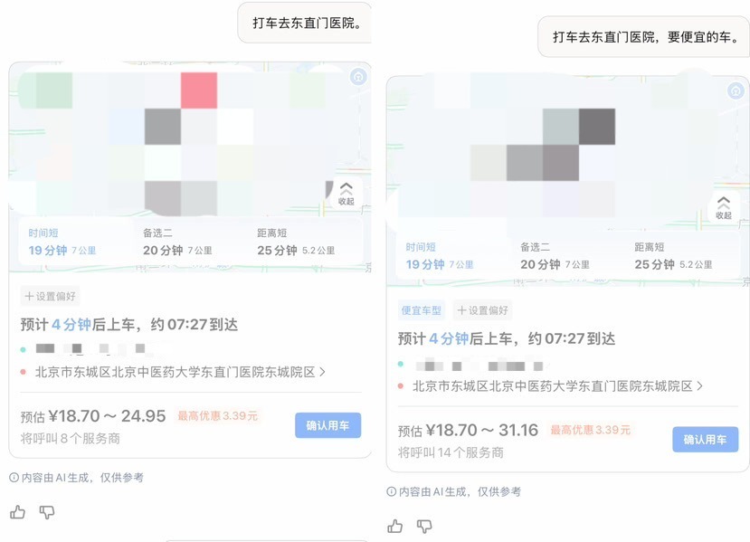这时刘女士才发现,AI叫车的界面变成了对话形式,可以用说话的方式告知叫车需求。刘女士直接说出了“我想打车去东直门医院”,系统又开始了第二次叫车。这次叫车的预估价格,明显比上次要高很多,刘女士赶紧又取消了叫车。对比之后才发现,原来第二次叫车只说了目的地,没说“要便宜的车”,所以价格比第一次贵了。